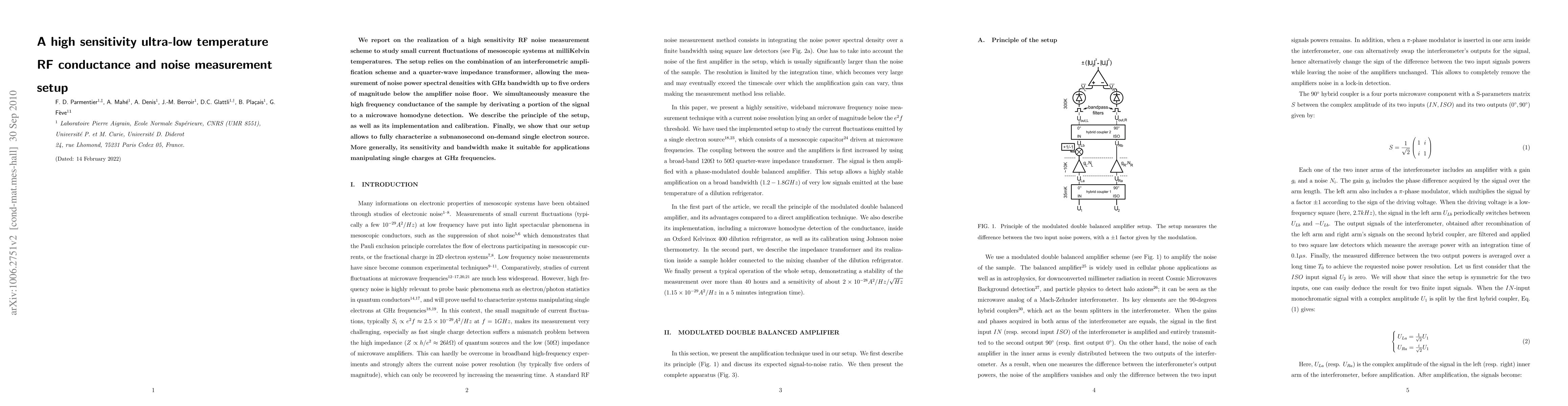 This paper presents a highly sensitive RF noise measurement setup for studying small current fluctuations in mesoscopic systems at milliKelvin temperatures. The setup combines interferometric amplification and a quarter-wave impedance transformer to achieve noise power spectral densities five orders of magnitude below the amplifier noise floor, enabling characterization of single electron sources and applications involving single charges at GHz frequencies.