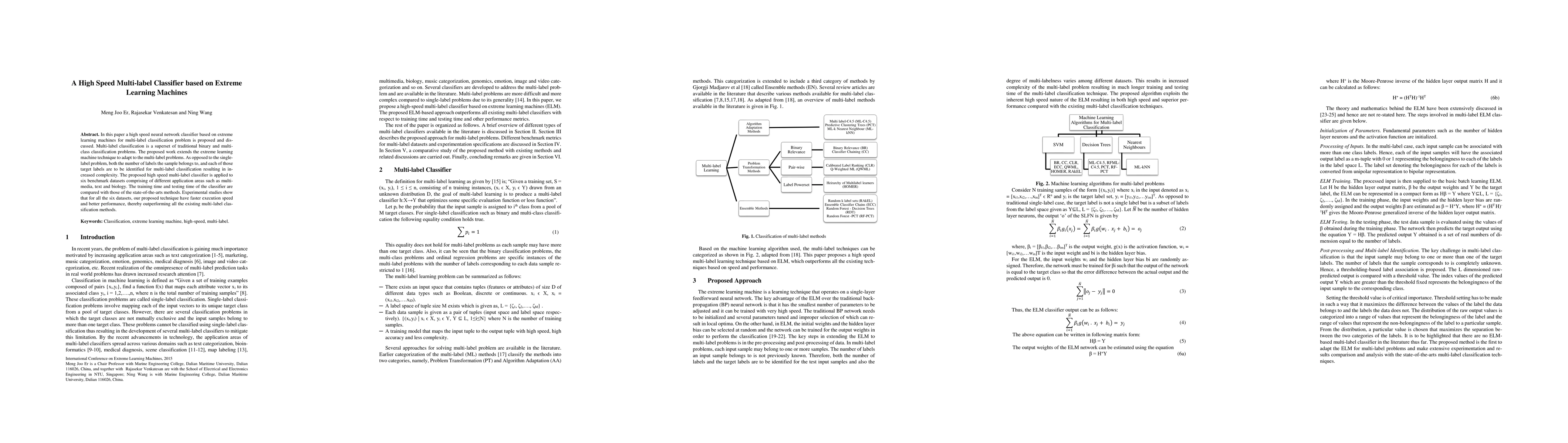 This paper proposes a high-speed multi-label classifier based on extreme learning machines, demonstrating superior performance and faster execution compared to state-of-the-art methods on six benchmark datasets across various domains. The technique effectively addresses the complexity of identifying multiple labels for each sample.