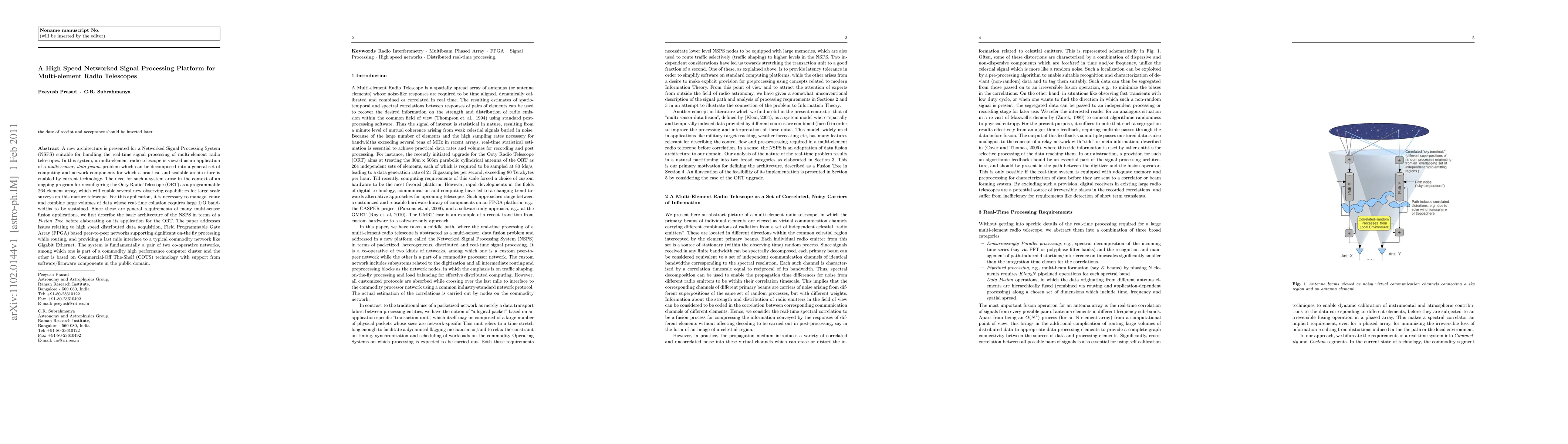 A new architecture is presented for a Networked Signal Processing System (NSPS) suitable for handling the real-time signal processing of multi-element radio telescopes. In this system, a multi-element radio telescope is viewed as an application of a multi-sensor, data fusion problem which can be decomposed into a general set of computing and network components for which a practical and scalable architecture is enabled by current technology. The need for such a system arose in the context of an ongoing program for reconfiguring the Ooty Radio Telescope (ORT) as a programmable 264-element array, which will enable several new observing capabilities for large scale surveys on this mature telescope. For this application, it is necessary to manage, route and combine large volumes of data whose real-time collation requires large I/O bandwidths to be sustained. Since these are general requirements of many multi-sensor fusion applications, we first describe the basic architecture of the NSPS in terms of a Fusion Tree before elaborating on its application for the ORT. The paper addresses issues relating to high speed distributed data acquisition, Field Programmable Gate Array (FPGA) based peer-to-peer networks supporting significant on-the fly processing while routing, and providing a last mile interface to a typical commodity network like Gigabit Ethernet. The system is fundamentally a pair of two co-operative networks, among which one is part of a commodity high performance computer cluster and the other is based on Commercial-Off The-Shelf (COTS) technology with support from software/firmware components in the public domain.