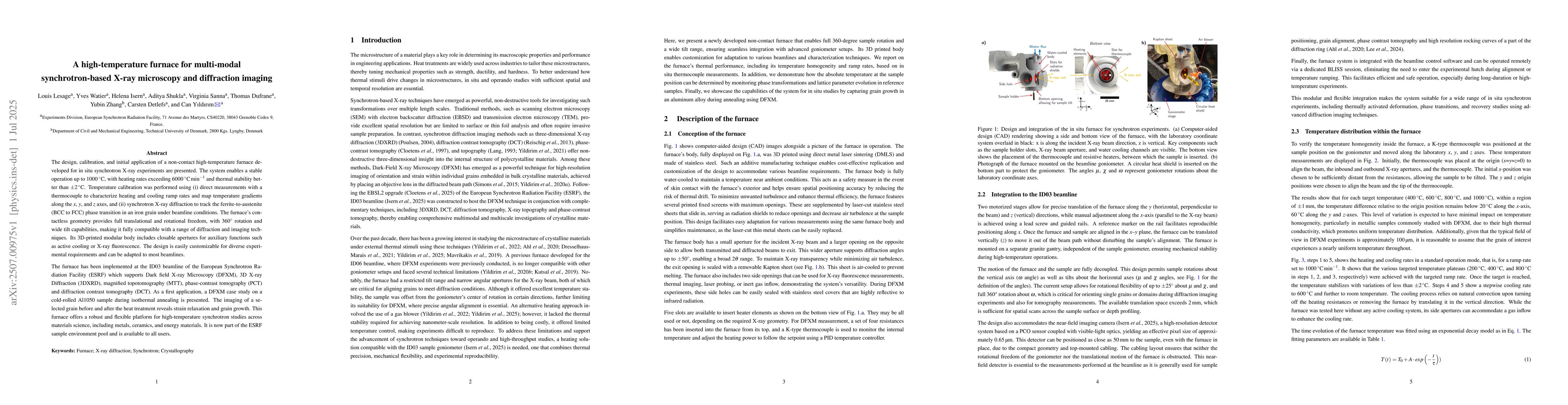 The design, calibration, and initial application of a non-contact high-temperature furnace developed for in situ synchrotron X-ray experiments are presented. The system enables a stable operation up to 1000 {\deg}C, with heating rates exceeding 6000 {\deg}C/min and thermal stability better than {\pm}2 {\deg}C. Temperature calibration was performed using (i) direct measurements with a thermocouple to characterize heating and cooling ramp rates and map temperature gradients along the x, y, and z axes, and (ii) synchrotron X-ray diffraction to track the ferrite-to-austenite (BCC to FCC) phase transition in an iron grain under beamline conditions. The furnace's contactless geometry provides full translational and rotational freedom, with 360{\deg} rotation and wide tilt capabilities, making it fully compatible with a range of diffraction and imaging techniques. Its 3D-printed modular body includes closable apertures for auxiliary functions such as active cooling or X-ray fluorescence. The design is easily customizable for diverse experimental requirements and can be adapted to most beamlines. The furnace has been implemented at the ID03 beamline of the European Synchrotron Radiation Facility (ESRF) which supports Dark field X-ray Microscopy (DFXM), 3D X-ray Diffraction (3DXRD), magnified topotomography (MTT), phase-contrast tomography (PCT) and diffraction contrast tomography (DCT). As a first application, a DFXM case study on a cold-rolled Al1050 sample during isothermal annealing is presented. The imaging of a selected grain before and after the heat treatment reveals strain relaxation and grain growth. This furnace offers a robust and flexible platform for high-temperature synchrotron studies across materials science, including metals, ceramics, and energy materials. It is now part of the ESRF sample environment pool and is available to all users.