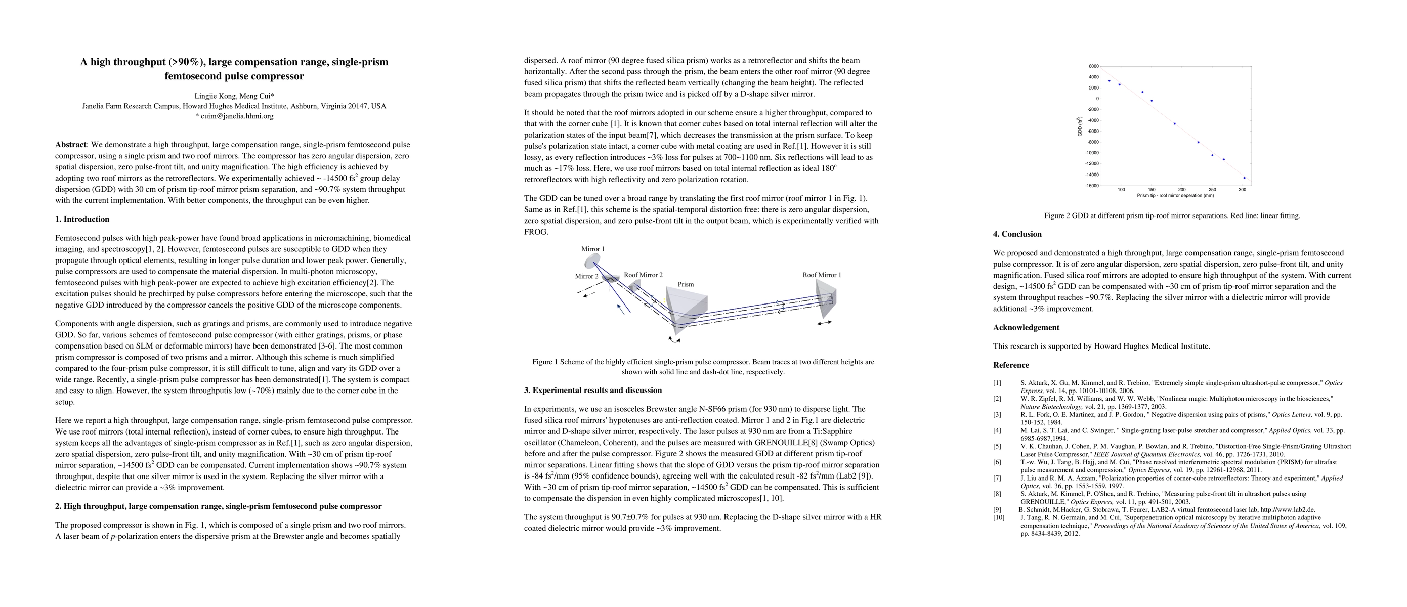 This paper presents a high-efficiency, single-prism femtosecond pulse compressor utilizing two roof mirrors, achieving over 90% throughput and a large compensation range with zero angular and spatial dispersion, pulse-front tilt, and unity magnification. Experimental results show a group delay dispersion compensation of ~ -14500 fs² and potential for even higher throughput with improved components.