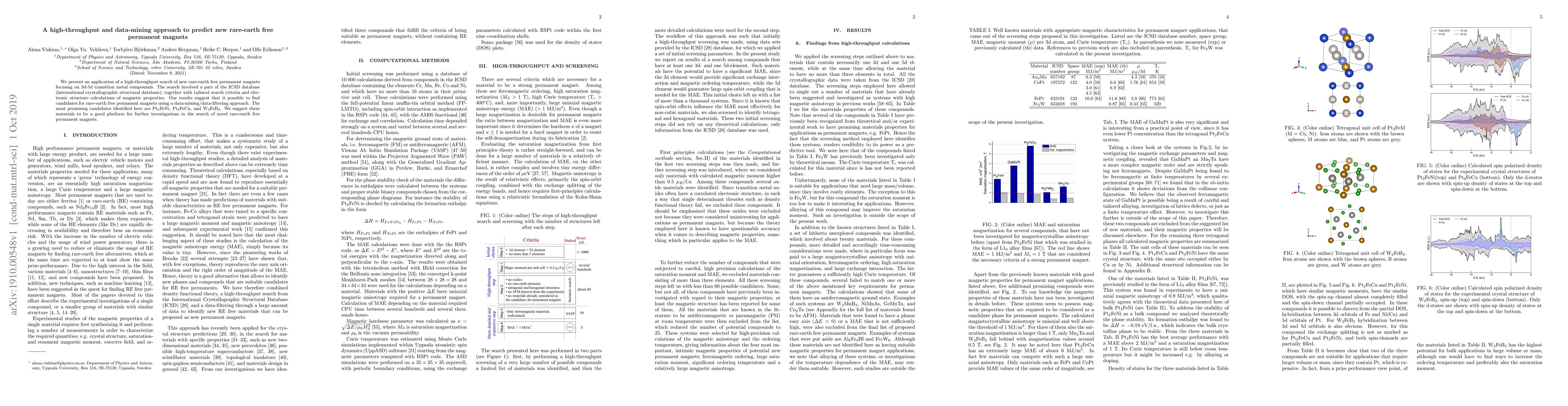 This research employs high-throughput computational methods to identify potential rare-earth free permanent magnets among 3d-5d transition metal compounds. Promising candidates Pt$_2$FeNi, Pt$_2$FeCu, and W$_2$FeB$_2$ were discovered using data-mining techniques and electronic structure calculations, suggesting a viable approach for future explorations.