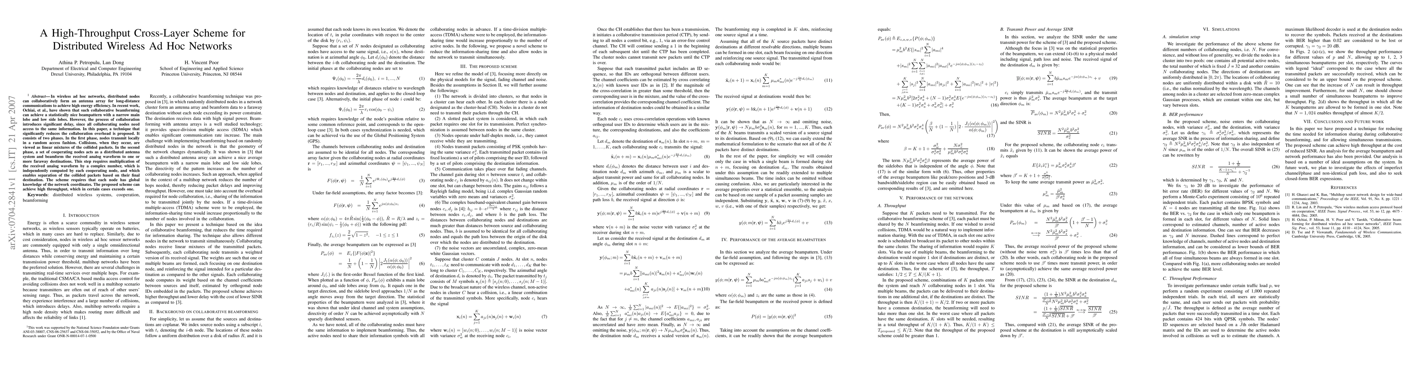 This paper proposes a high-throughput cross-layer scheme for wireless ad hoc networks that reduces collaboration overhead through a two-phase process: random access transmission followed by distributed antenna beamforming to separate collided packets based on destination, achieving high energy efficiency and throughput.