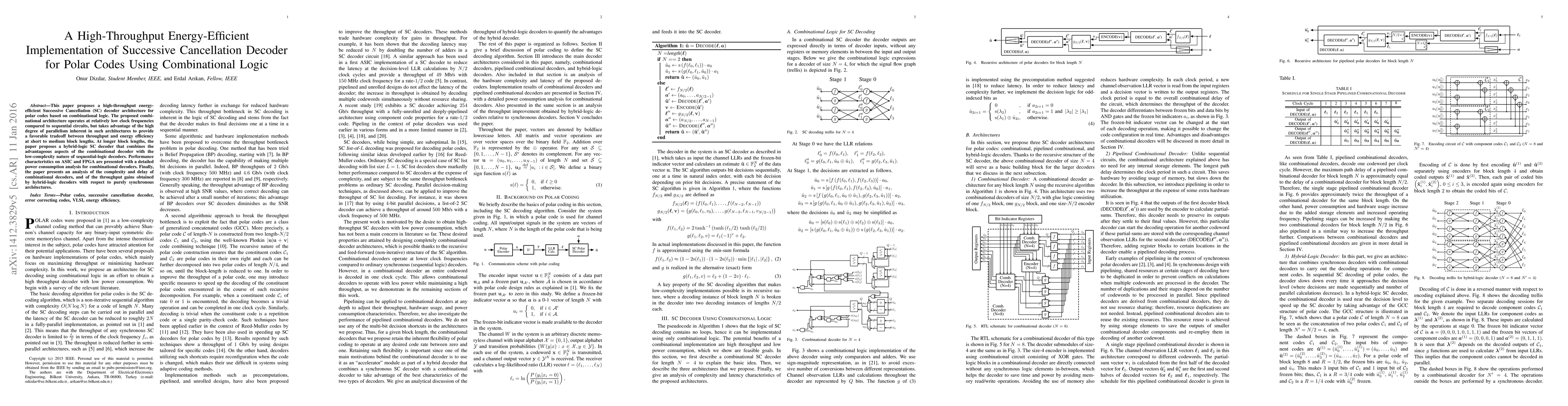 This paper presents a high-throughput, energy-efficient successive-cancellation decoder for polar codes utilizing combinational logic, achieving favorable throughput-energy tradeoffs at shorter block lengths, and a hybrid-logic approach for longer block lengths. Performance and power consumption analyses on ASIC and FPGA are provided.