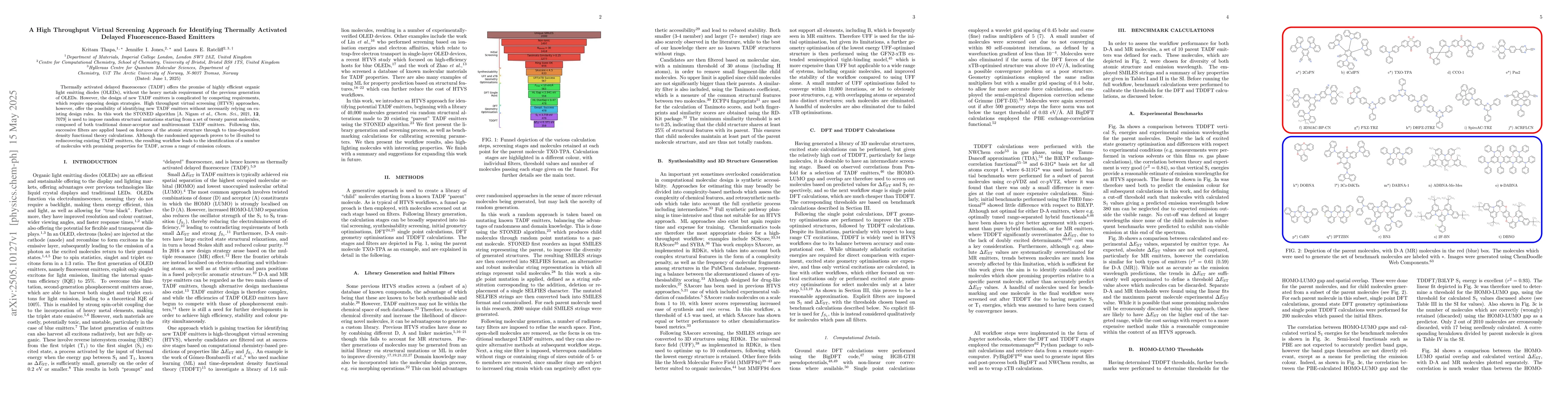The research employs the STONED algorithm to perform high throughput virtual screening (HTVS) on a set of twenty parent molecules, applying successive filters based on atomic structure features and time-dependent density functional theory calculations to identify new TADF emitters.