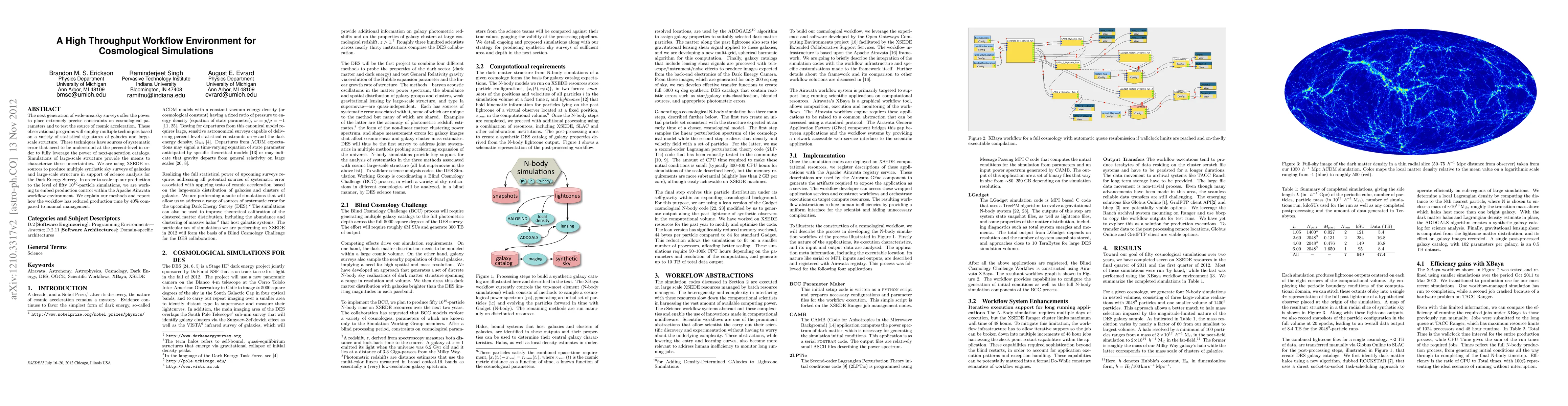 The next generation of wide-area sky surveys offer the power to place extremely precise constraints on cosmological parameters and to test the source of cosmic acceleration. These observational programs will employ multiple techniques based on a variety of statistical signatures of galaxies and large-scale structure. These techniques have sources of systematic error that need to be understood at the percent-level in order to fully leverage the power of next-generation catalogs. Simulations of large-scale structure provide the means to characterize these uncertainties. We are using XSEDE resources to produce multiple synthetic sky surveys of galaxies and large-scale structure in support of science analysis for the Dark Energy Survey. In order to scale up our production to the level of fifty 10^10-particle simulations, we are working to embed production control within the Apache Airavata workflow environment. We explain our methods and report how the workflow has reduced production time by 40% compared to manual management.