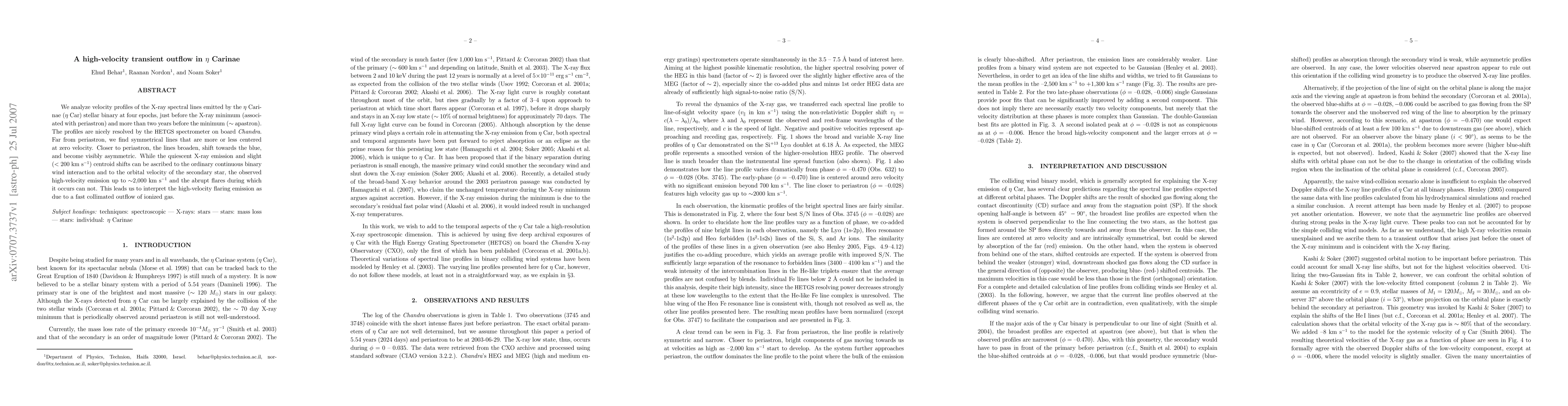 This study reveals a high-velocity transient outflow in Eta Carinae, detected via X-ray spectral lines, which shows significant broadening and asymmetry close to periastron. The high-velocity emission, up to ~2,000 km/sec, suggests a fast collimated outflow of ionized gas, distinct from the ordinary binary wind interaction.