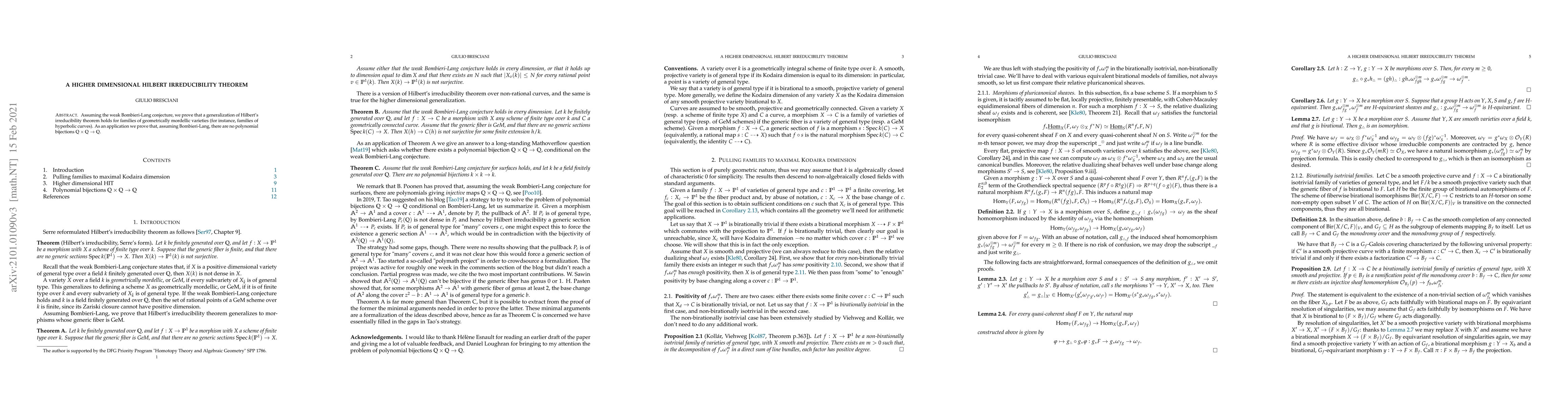 Researchers prove a higher dimensional version of Hilbert's irreducibility theorem for families of geometrically mordellic varieties, assuming the weak Bombieri-Lang conjecture. This leads to a significant application: there can be no polynomial bijections from λ² to λ².