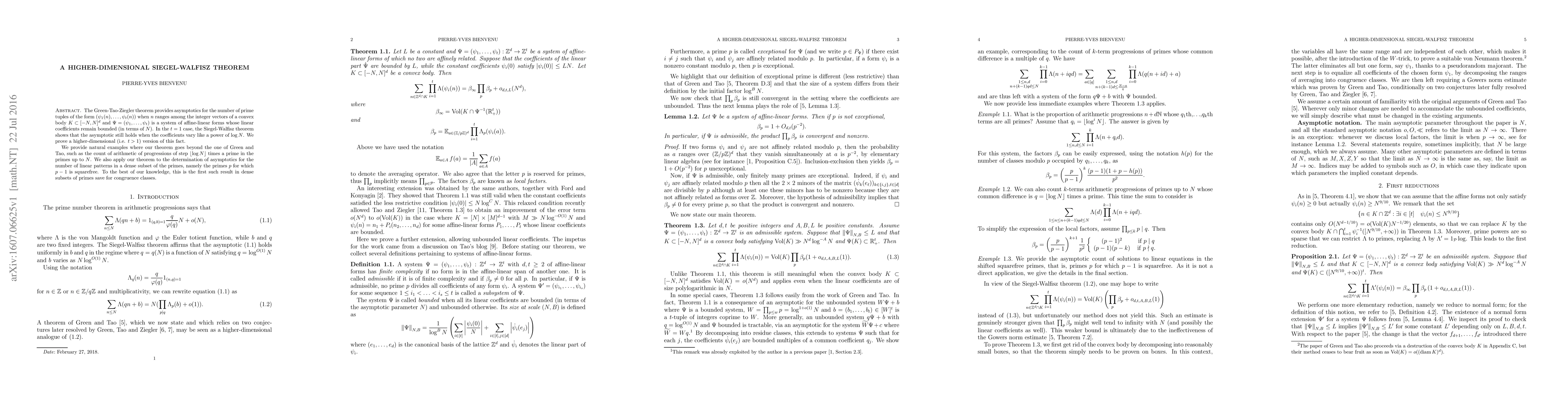The paper proves a higher-dimensional extension of the Siegel-Walfisz theorem, showing that the asymptotic count of prime tuples holds even when coefficients vary like a power of $\log N$. It provides applications to counting arithmetic progressions and determining linear patterns in dense subsets of primes.