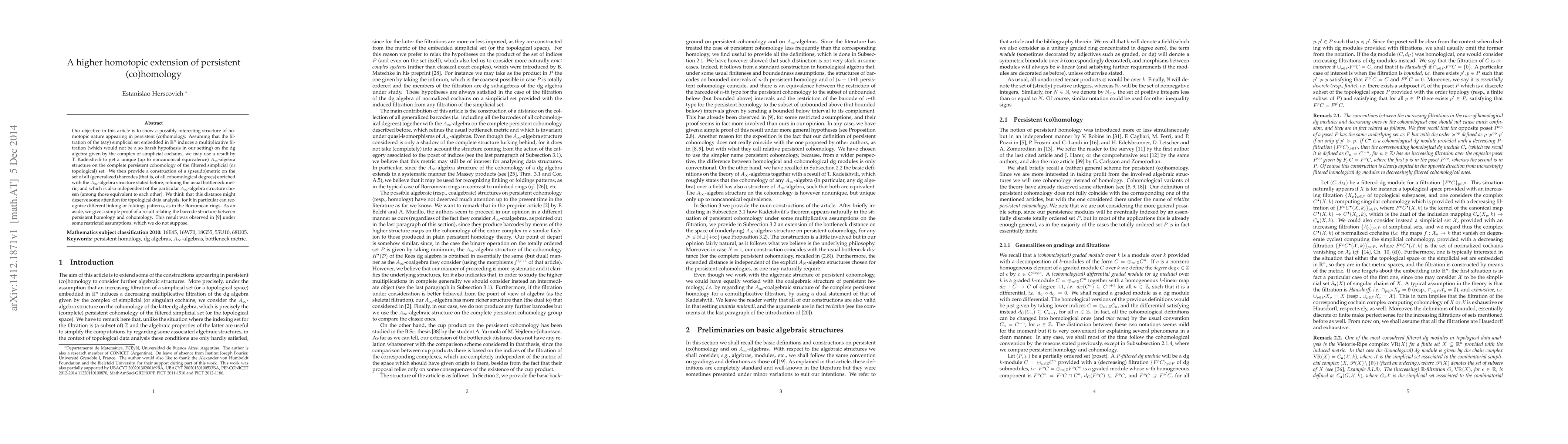 Our objective in this article is to show a possibly interesting structure of homotopic nature appearing in persistent (co)homology. Assuming that the filtration of the (say) simplicial set embedded in a finite dimensional vector space induces a multiplicative filtration (which would not be a so harsh hypothesis in our setting) on the dg algebra given by the complex of simplicial cochains, we may use a result by T. Kadeishvili to get a unique (up to noncanonical equivalence) A_infinity-algebra structure on the complete persistent cohomology of the filtered simplicial (or topological) set. We then provide a construction of a (pseudo)metric on the set of all (generalized) barcodes (that is, of all cohomological degrees) enriched with the A_infinity-algebra structure stated before, refining the usual bottleneck metric, and which is also independent of the particular A_infinity-algebra structure chosen (among those equivalent to each other). We think that this distance might deserve some attention for topological data analysis, for it in particular can recognize different linking or foldings patterns, as in the Borromean rings. As an aside, we give a simple proof of a result relating the barcode structure between persistent homology and cohomology. This result was observed in a recent article by V. de Silva, D. Morozov and M. Vejdemo-Johansson under some restricted assumptions, which we do not suppose.