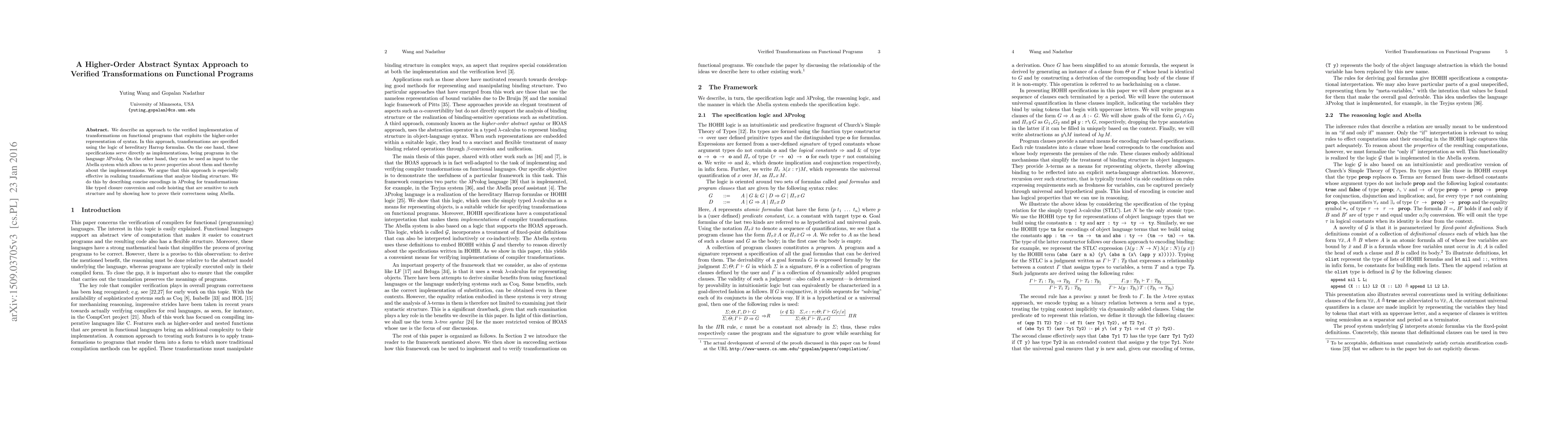 This paper proposes a higher-order abstract syntax method for verified transformations on functional programs, utilizing hereditary Harrop formulas for specifications. These specifications serve both as direct implementations in Lambda Prolog and as inputs to the Abella system for proving properties, demonstrating effectiveness in transformations that analyze binding structure.