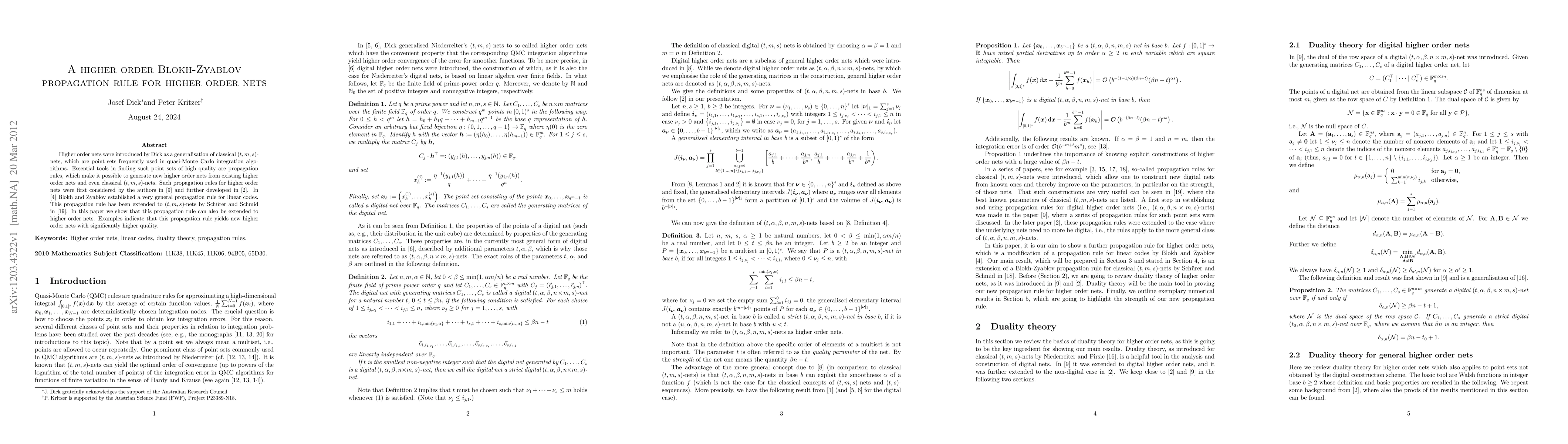 This paper extends the Blokh-Zyablov propagation rule, originally developed for linear codes and later for $(t,m,s)$-nets, to higher order nets. The authors demonstrate that this rule can generate new higher order nets with notably improved quality, enhancing quasi-Monte Carlo integration algorithms.