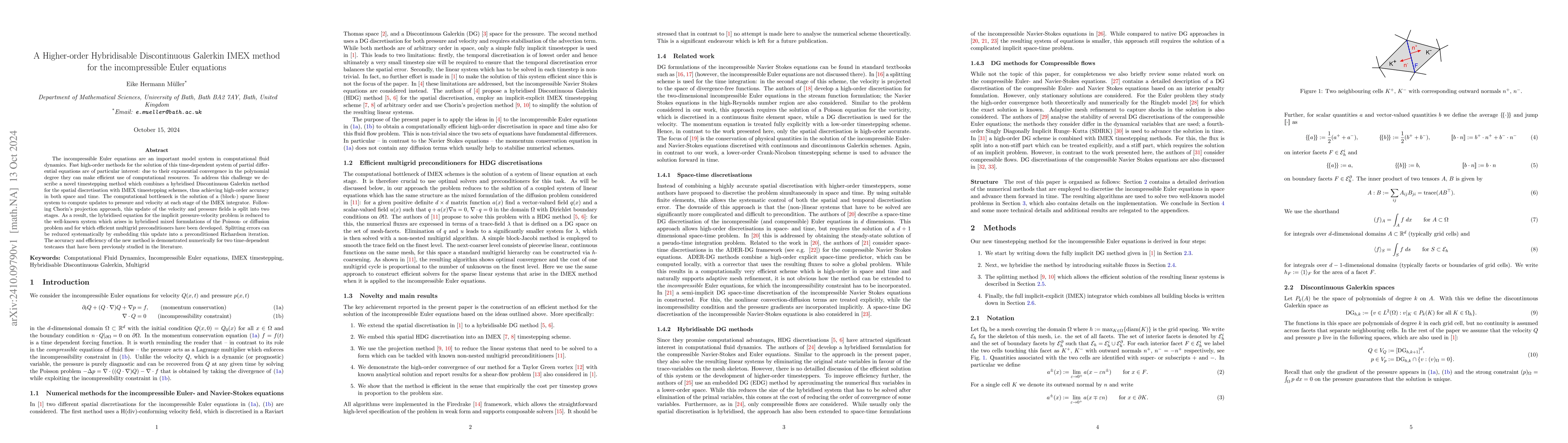 This paper introduces a novel hybridisable Discontinuous Galerkin IMEX method for solving the incompressible Euler equations, combining high-order spatial discretisation with implicit-explicit timestepping for improved efficiency. The method uses Chorin's projection approach and efficient multigrid preconditioners to address computational bottlenecks, demonstrated through accurate and efficient numerical solutions of test cases.
