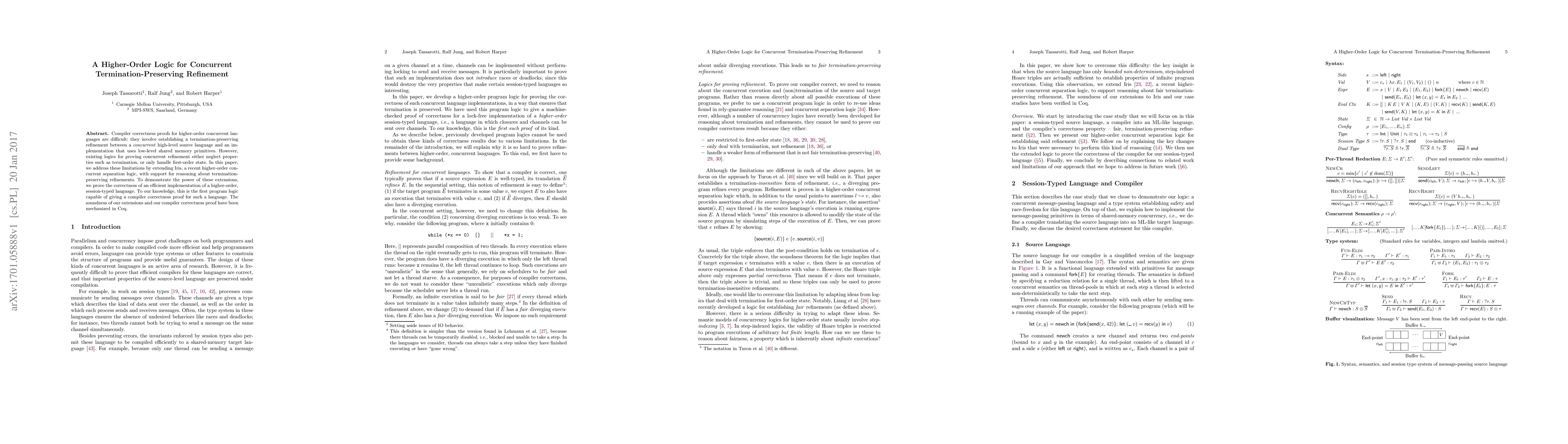This paper extends Iris, a higher-order concurrent separation logic, to reason about termination-preserving refinements in concurrent languages, addressing limitations in existing logics. The authors demonstrate its power by proving the correctness of an efficient implementation for a higher-order, session-typed language, mechanizing the soundness and proof in Coq.