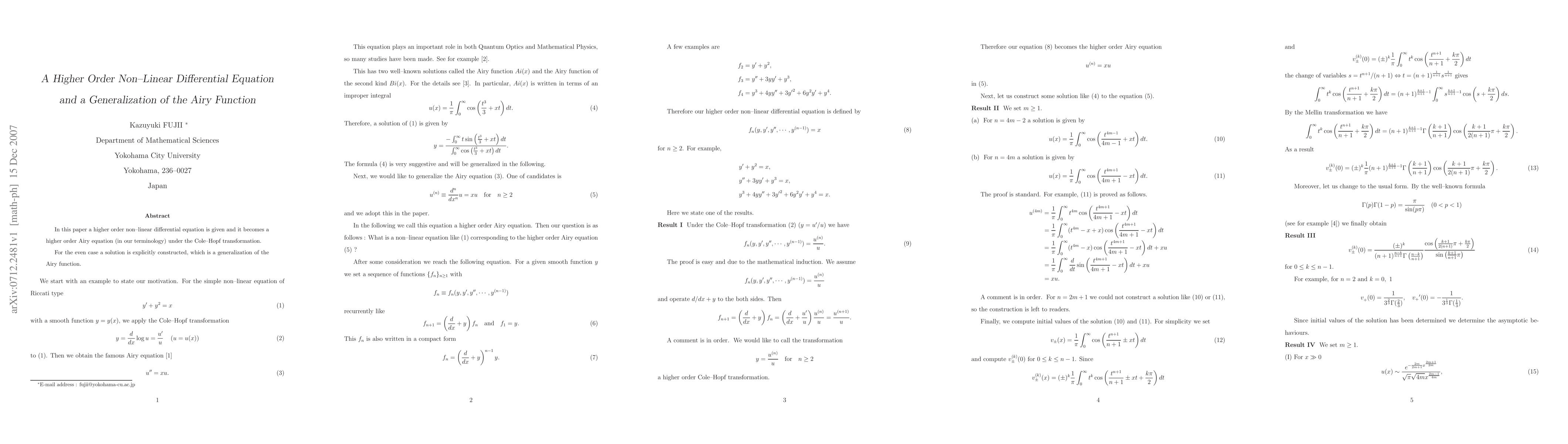 Researchers introduced a higher order non-linear differential equation that transforms into a higher order Airy equation under the Cole-Hopf transformation, revealing a generalization of the Airy function for the even case.