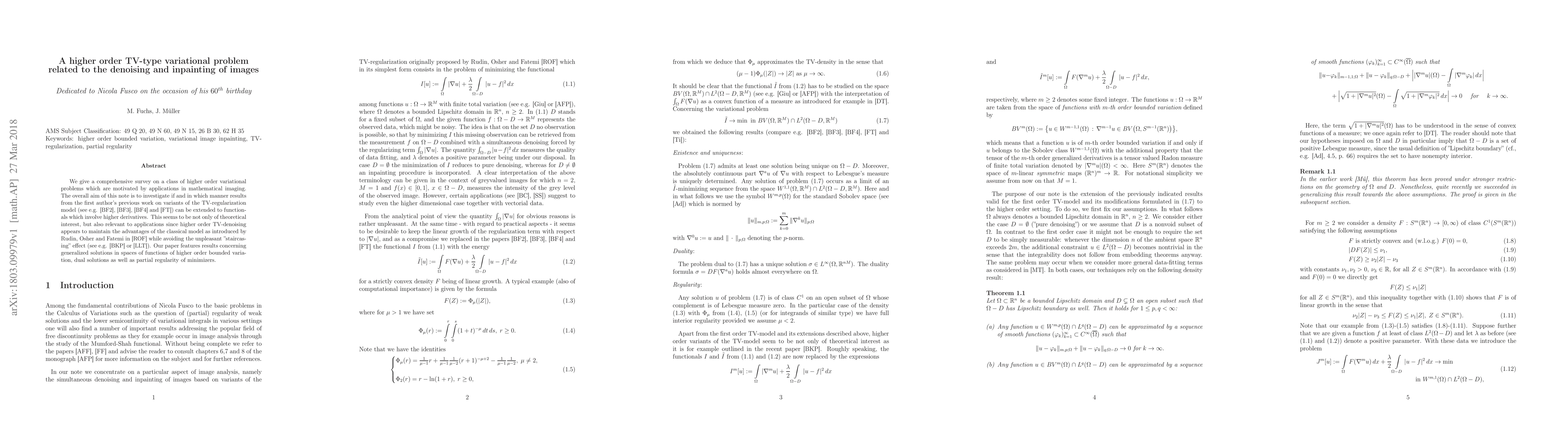 We give a comprehensive survey on a class of higher order variational problems which are motivated by applications in mathematical imaging. The overall aim of this note is to investigate if and in which manner results from the first author's previous work on variants of the TV-regularization model (see e.g. [BF1], [BF2], [BF3] and [FT]) can be extended to functionals which involve higher derivatives. This seems to be not only of theoretical interest, but also relevant to applications since higher order TV-denoising appears to maintain the advantages of the classical model as introduced by Rudin, Osher and Fatemi in [ROF] while avoiding the unpleasant "staircasing" effect (see e.g. [BKP] or [LLT]). Our paper features results concerning generalized solutions in spaces of functions of higher order bounded variation, dual solutions as well as partial regularity of minimizers.