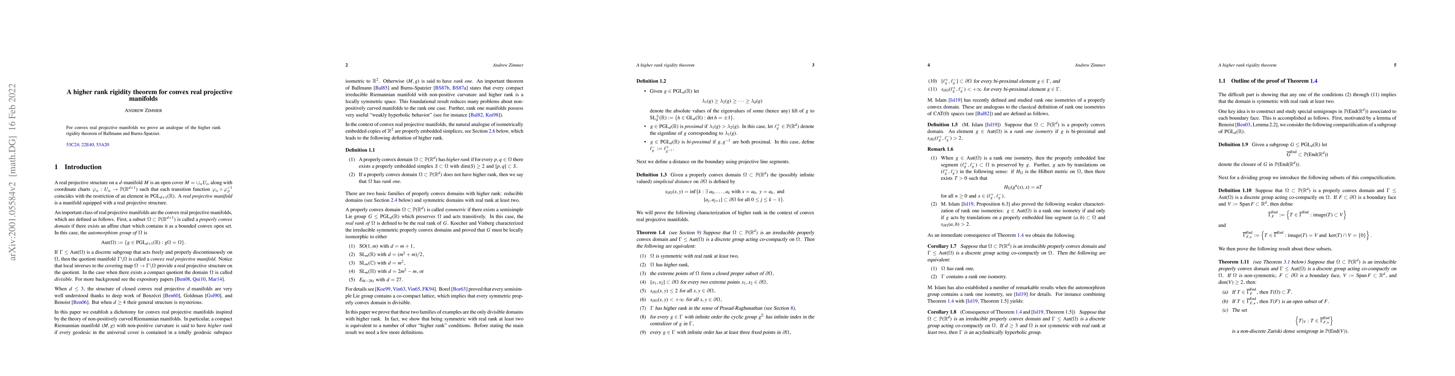 Summary: This paper establishes a higher rank rigidity theorem for convex real projective manifolds, analogous to the results by Ballmann and Burns-Spatzier. The findings demonstrate the structural stability of these manifolds under certain conditions.