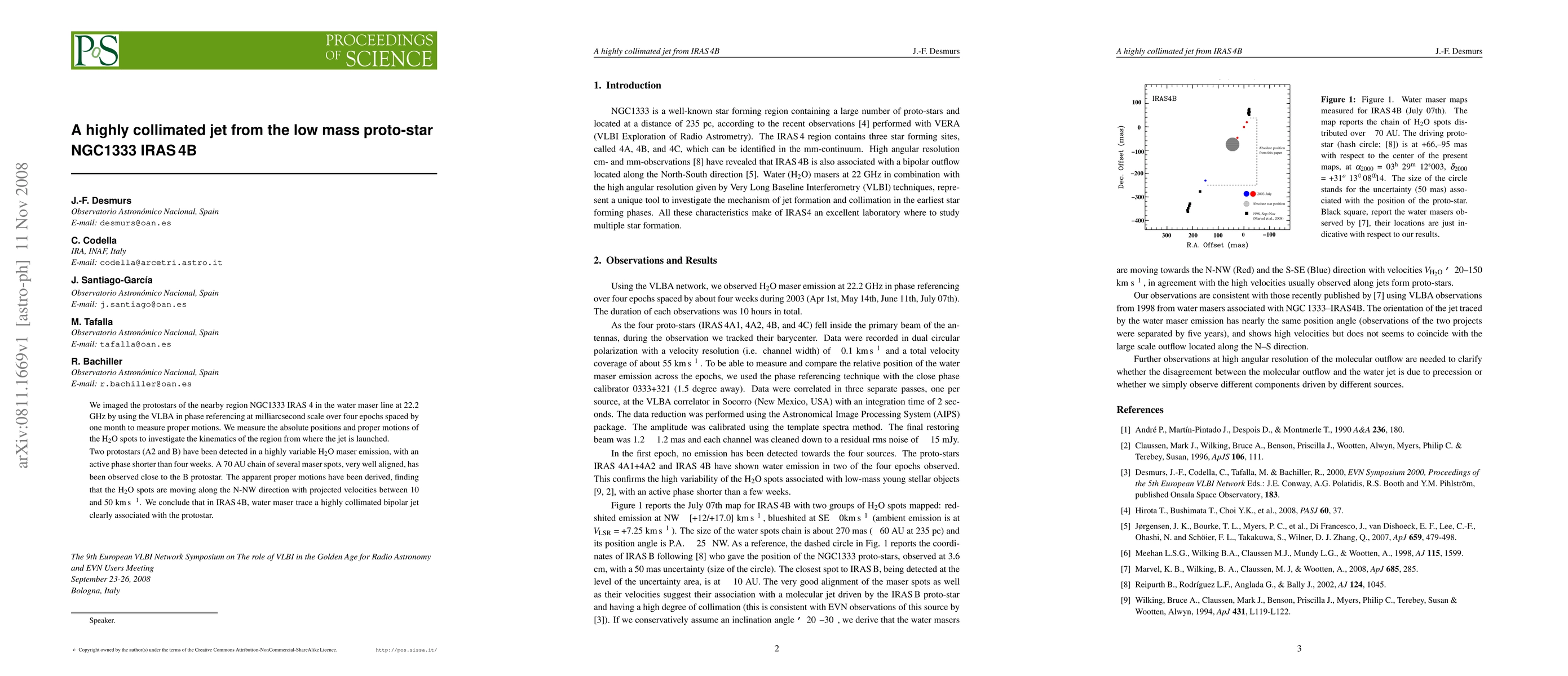 We imaged the protostars of the nearby region NGC1333 IRAS 4 in the water maser line at 22.2 GHz by using the VLBA in phase referencing at milliarcsecond scale over four epochs spaced by one month to measure proper motions. We measure the absolute positions and proper motions of the H2O spots to investigate the kinematics of the region from where the jet is launched. Two protostars (A2 and B) have been detected in a highly variable H2O maser emission, with an active phase shorter than four weeks. A 70 AU chain of several maser spots, very well aligned, has been observed close to the B protostar. The apparent proper motions have been derived, finding that the H2O spots are moving along the N-NW direction with projected velocities between 10 and 50 km/s. We conclude that in IRAS 4B, water maser trace a highly collimated bipolar jet clearly associated with the protostar.