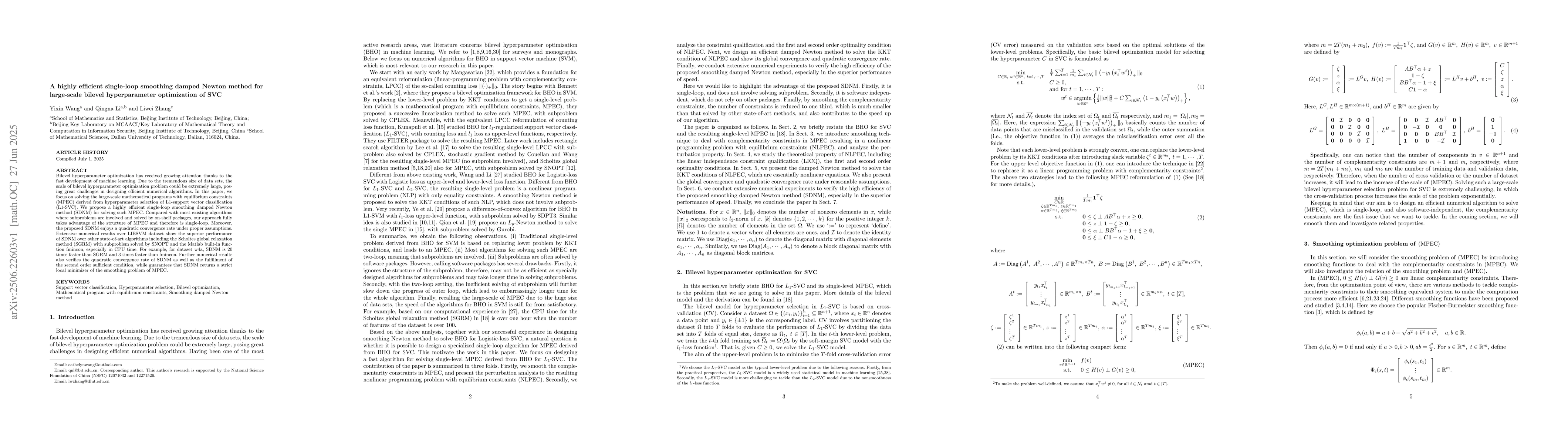 Bilevel hyperparameter optimization has received growing attention thanks to the fast development of machine learning. Due to the tremendous size of data sets, the scale of bilevel hyperparameter optimization problem could be extremely large, posing great challenges in designing efficient numerical algorithms. In this paper, we focus on solving the large-scale mathematical programs with equilibrium constraints (MPEC) derived from hyperparameter selection of L1-support vector classification (L1-SVC). We propose a highly efficient single-loop smoothing damped Newton method (SDNM) for solving such MPEC. Compared with most existing algorithms where subproblems are involved and solved by on-shelf packages, our approach fully takes advantage of the structure of MPEC and therefore is single-loop. Moreover, the proposed SDNM enjoys a quadratic convergence rate under proper assumptions. Extensive numerical results over LIBSVM dataset show the superior performance of SDNM over other state-of-art algorithms including the Scholtes global relaxation method (SGRM) with subproblem solved by SNOPT and the Matlab built-in function fmincon, especially in CPU time. For example, for dataset w4a, SDNM is 20 times faster than SGRM and 3 times faster than fmincon. Further numerical results also verifies the quadratic convergence rate of SDNM as well as the fulfillment of the second order sufficient condition, while guarantees that SDNM returns a strict local minimizer of the smoothing problem of MPEC.
