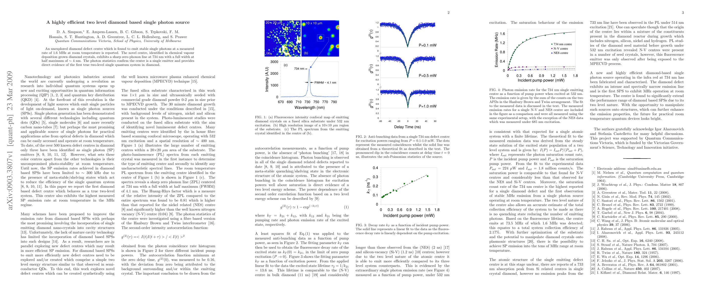 A new diamond defect, emitting stable single photons at 1.6 MHz at room temperature, is discovered. This defect, found in CVD diamond, is a sharp single emitter with a zero phonon line at 734 nm, representing the first true two-level single quantum system in diamond.