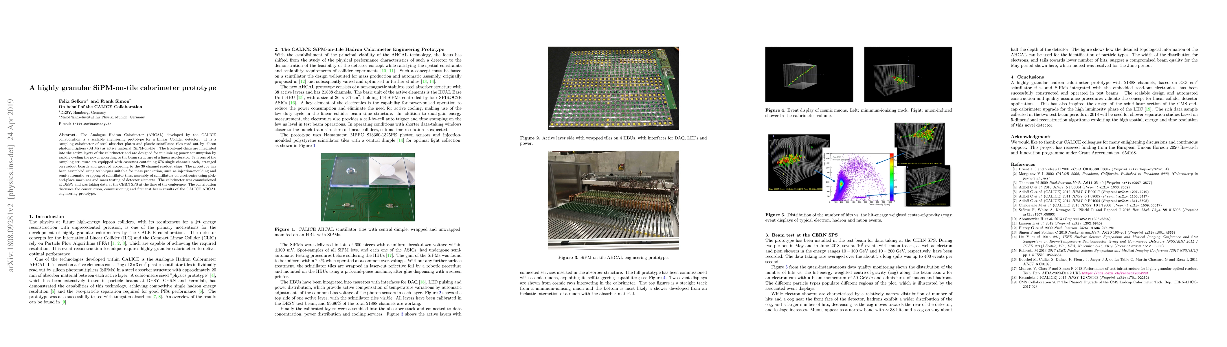 The CALICE collaboration developed a scalable prototype for a Linear Collider detector, the Analogue Hadron Calorimeter (AHCAL), featuring a SiPM-on-tile design with 38 layers of steel and plastic scintillator. The prototype was commissioned at DESY and tested at CERN SPS, showcasing techniques for mass production and initial test beam results.