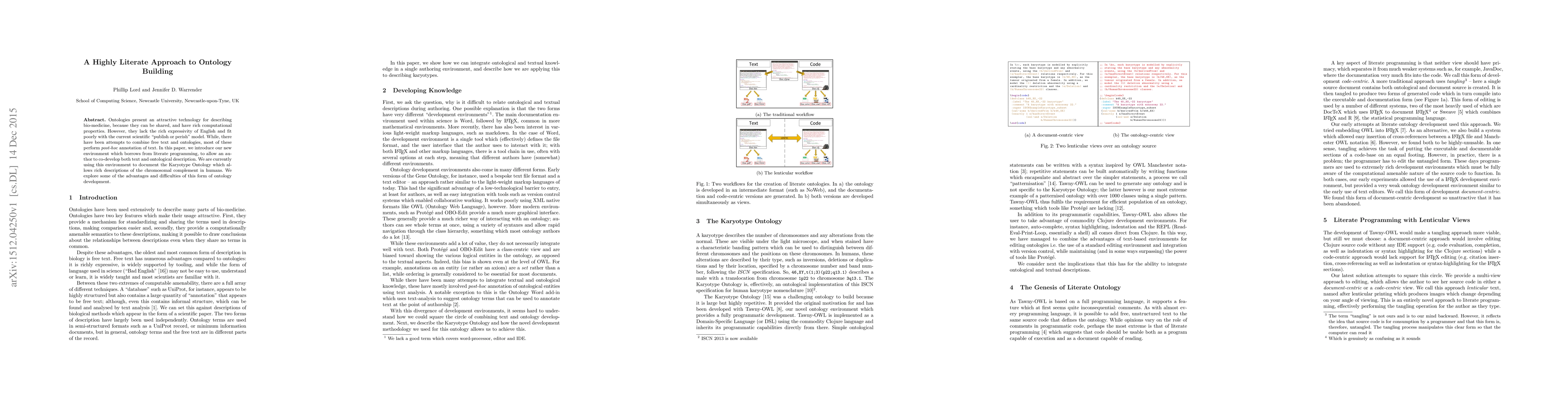 Ontologies present an attractive technology for describing bio-medicine, because they can be shared, and have rich computational properties. However, they lack the rich expressivity of English and fit poorly with the current scientific "publish or perish" model. While, there have been attempts to combine free text and ontologies, most of these perform \textit{post-hoc} annotation of text. In this paper, we introduce our new environment which borrows from literate programming, to allow an author to co-develop both text and ontological description. We are currently using this environment to document the Karyotype Ontology which allows rich descriptions of the chromosomal complement in humans. We explore some of the advantages and difficulties of this form of ontology development.