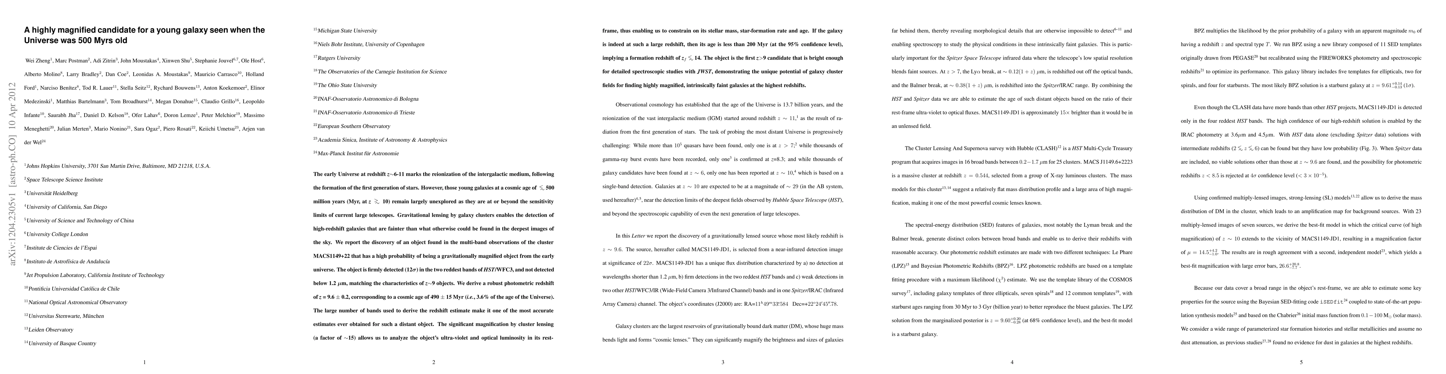 This paper reports the discovery of a highly magnified galaxy candidate from the early Universe, with a robust photometric redshift of z = 9.6 ± 0.2, corresponding to a cosmic age of 490 ± 15 Myrs. The galaxy, detected via gravitational lensing in the MACS1149+22 cluster, provides insights into its stellar mass, star-formation rate, and age, marking a significant step in exploring galaxies from just 3.6% of the Universe's age.
