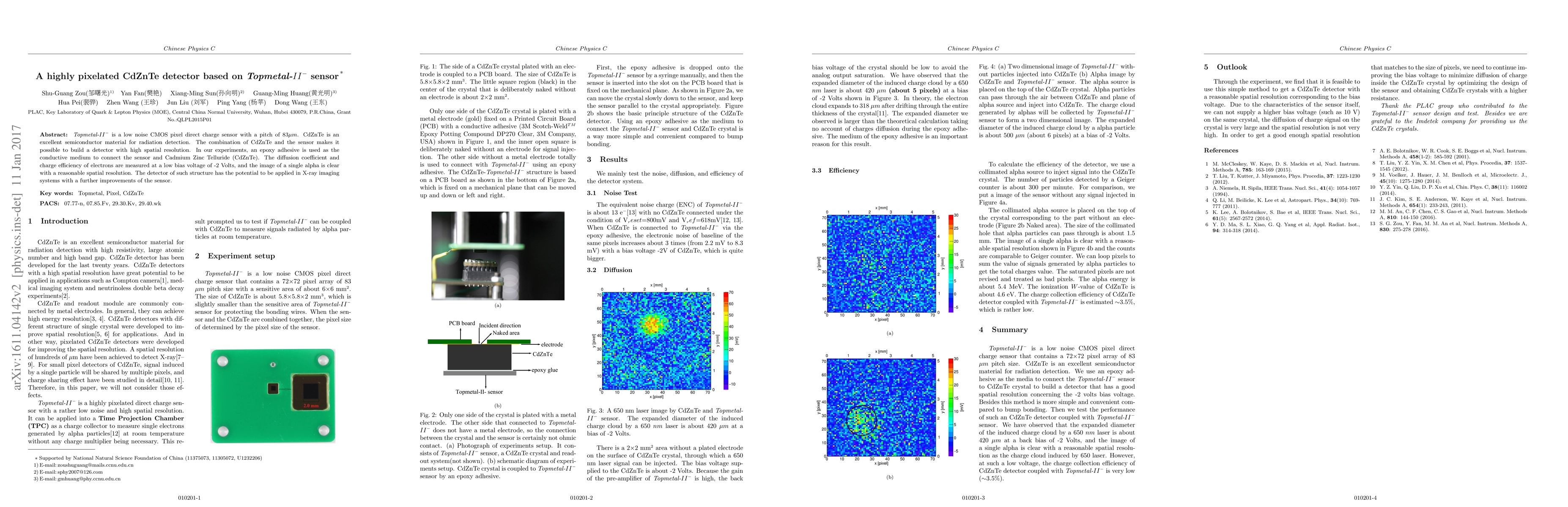 \textit{Topmetal-${II}^-$} is a low noise CMOS pixel direct charge sensor with a pitch of 83$\mu m$. CdZnTe is an excellent semiconductor material for radiation detection. The combination of CdZnTe and the sensor makes it possible to build a detector with high spatial resolution. In our experiments, an epoxy adhesive is used as the conductive medium to connect the sensor and Cadmium Zinc Telluride (CdZnTe). The diffusion coefficient and charge efficiency of electrons are measured at a low bias voltage of -2 Volts, and the image of a single alpha is clear with a reasonable spatial resolution. The detector of such structure has the potential to be applied in X-ray imaging systems with a further improvements of the sensor.