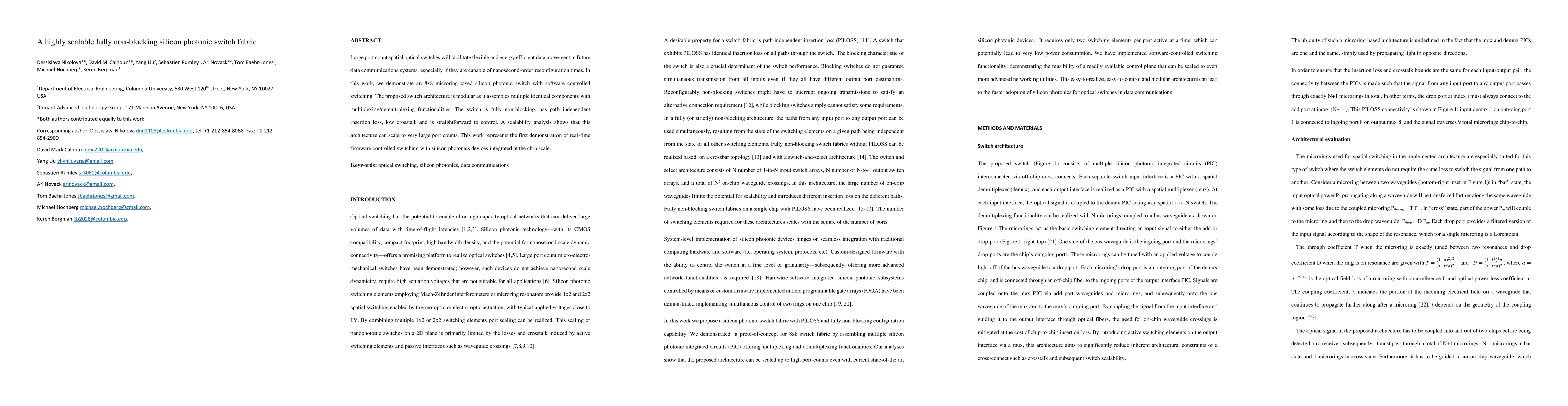 This research introduces an 8x8 silicon photonic switch fabric composed of microrings, demonstrating fully non-blocking, scalable, and low-loss optical switching capabilities. The modular architecture enables rapid reconfiguration and represents the first real-time firmware-controlled silicon photonics switch at the chip scale.