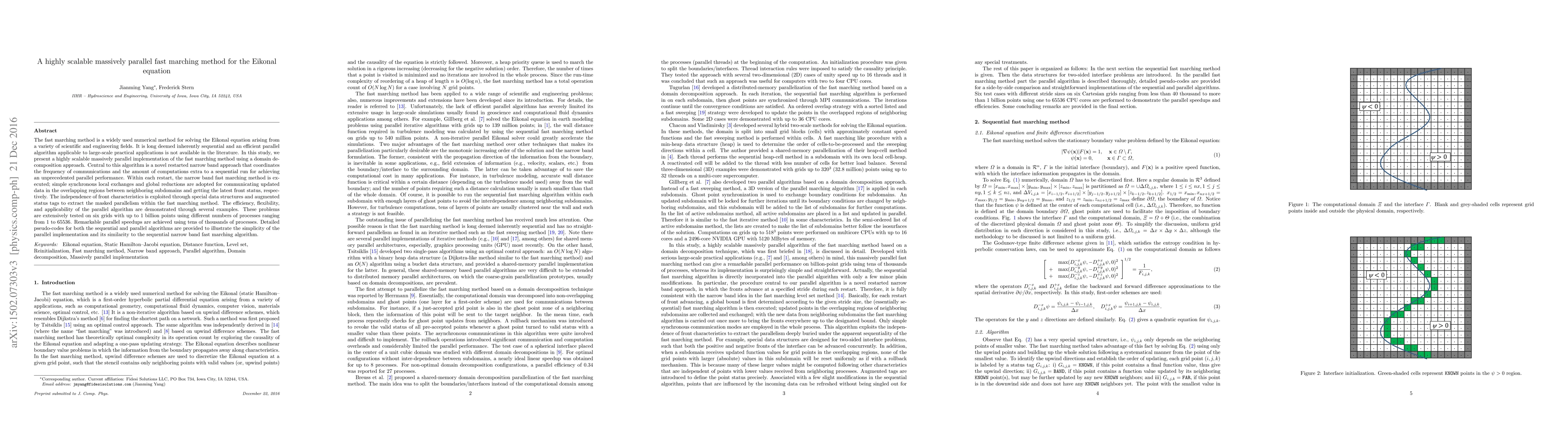 The fast marching method is a widely used numerical method for solving the Eikonal equation arising from a variety of scientific and engineering fields. It is long deemed inherently sequential and an efficient parallel algorithm applicable to large-scale practical applications is not available in the literature. In this study, we present a highly scalable massively parallel implementation of the fast marching method using a domain decomposition approach. Central to this algorithm is a novel restarted narrow band approach that coordinates the frequency of communications and the amount of computations extra to a sequential run for achieving an unprecedented parallel performance. Within each restart, the narrow band fast marching method is executed; simple synchronous local exchanges and global reductions are adopted for communicating updated data in the overlapping regions between neighboring subdomains and getting the latest front status, respectively. The independence of front characteristics is exploited through special data structures and augmented status tags to extract the masked parallelism within the fast marching method. The efficiency, flexibility, and applicability of the parallel algorithm are demonstrated through several examples. These problems are extensively tested on six grids with up to 1 billion points using different numbers of processes ranging from 1 to 65536. Remarkable parallel speedups are achieved using tens of thousands of processes. Detailed pseudo-codes for both the sequential and parallel algorithms are provided to illustrate the simplicity of the parallel implementation and its similarity to the sequential narrow band fast marching algorithm.