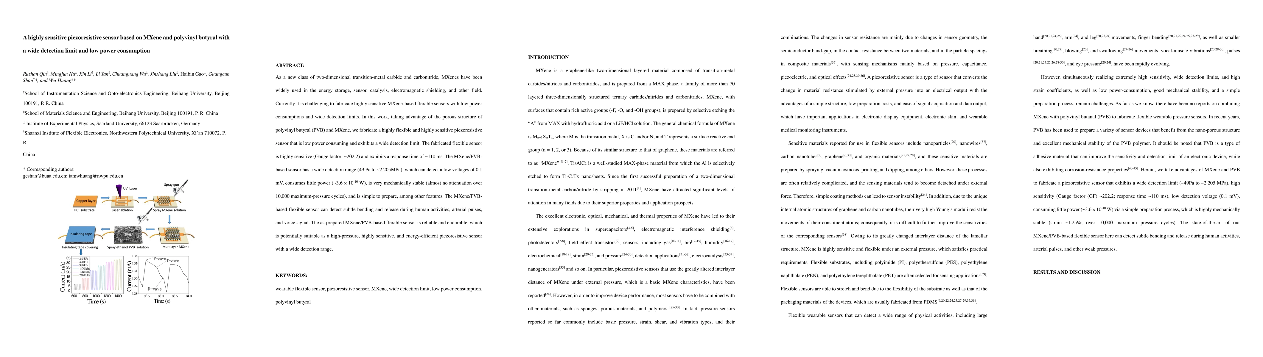 This paper presents a highly sensitive piezoresistive sensor based on MXene and polyvinyl butyral, achieving a wide detection range from 31.2 Pa to 2.205 MPa with low power consumption and fast response time. The sensor demonstrates excellent mechanical stability and potential for detecting subtle human activities.