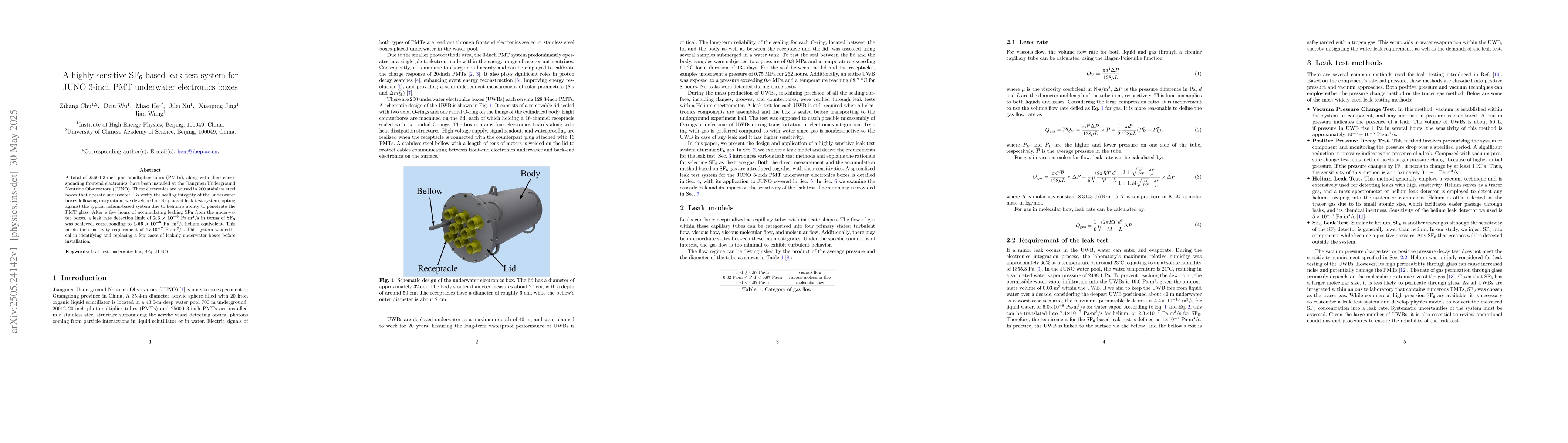 The research developed an SF6-based leak test system for verifying the sealing integrity of underwater electronics boxes housing 3-inch PMTs at JUNO, opting for SF6 over helium due to helium's permeability through PMT glass.