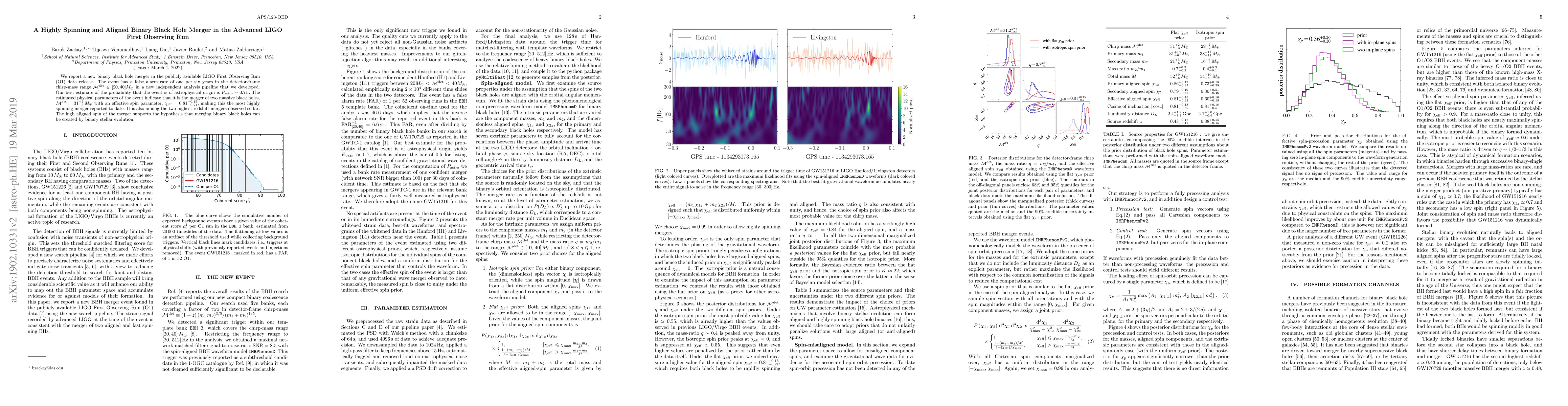 We report a new binary black hole merger in the publicly available LIGO First Observing Run (O1) data release. The event has an inverse false alarm rate of one per six years in the detector-frame chirp-mass range $\mathcal{M}^{\rm det} \in [20,40]M_\odot$ in a new independent analysis pipeline that we developed. Our best estimate of the probability that the event is of astrophysical origin is $P_{\rm astro} \sim 0.71\, .$ The estimated physical parameters of the event indicate that it is the merger of two massive black holes, $\mathcal{M}^{\rm det} = 31^{+2}_{-3}\,M_\odot$ with an effective spin parameter, $\chi_{\rm eff} = 0.81^{+0.15}_{-0.21}$, making this the most highly spinning merger reported to date. It is also among the two highest redshift mergers observed so far. The high aligned spin of the merger supports the hypothesis that merging binary black holes can be created by binary stellar evolution.