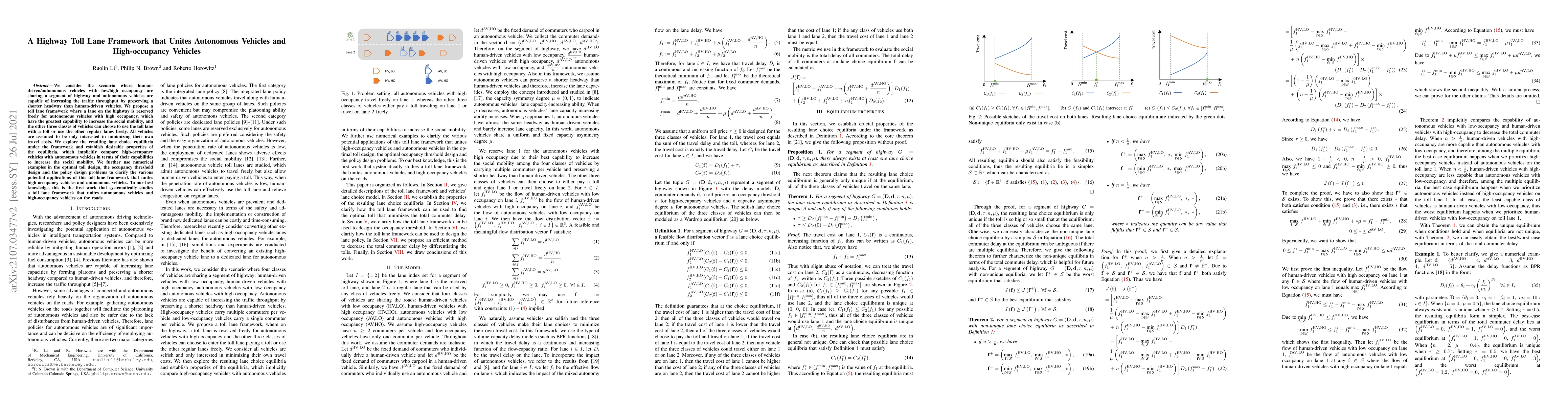 This paper proposes a toll lane framework for highways that prioritizes autonomous vehicles with high occupancy to enhance traffic throughput, while allowing other vehicle types to choose between tolled and free lanes. The study explores the resulting equilibria and optimal toll designs, establishing the framework's potential to increase social mobility.