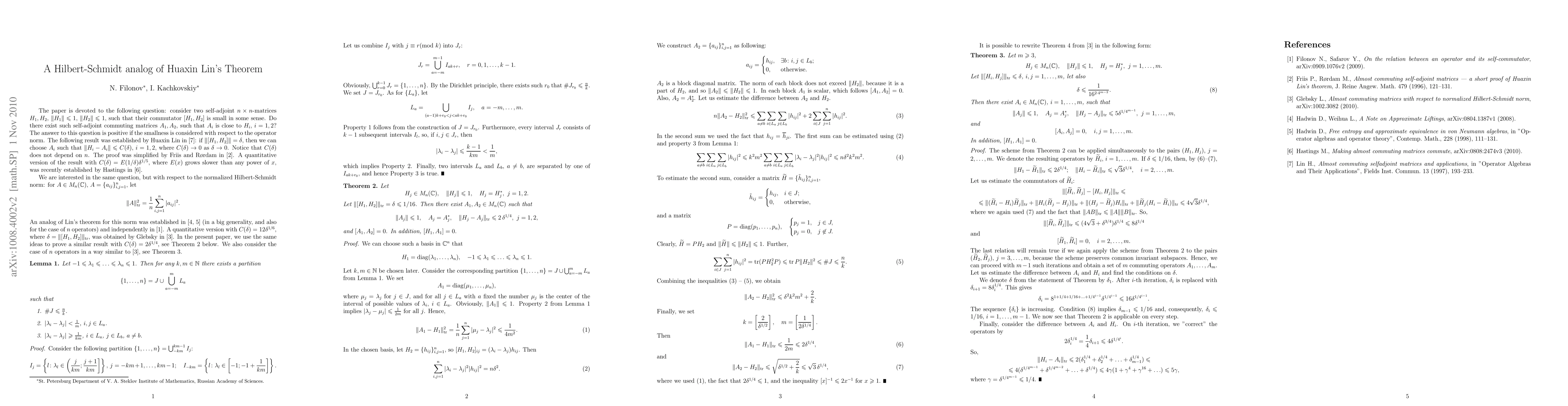 The paper is devoted to the following question: consider two self-adjoint $n\times n$-matrices $H_1,H_2$, $\|H_1\|\le 1$, $\|H_2\|\le 1$, such that their commutator $[H_1,H_2]$ is small in some sence. Do there exist such self-adjoint commuting matrices $A_1,A_2$, such that $A_i$ is close to $H_i$, $i=1,2$? The answer to this question is positive if the smallness is considered with respect to the operator norm. The following result was established by Huaxin Lin: if $\|[H_1,H_2]\|=\delta$, then we can choose $A_i$ such that $\|H_i-A_i\|\le C(\delta)$, $i=1,2$, where $C(\delta)\to 0$ as $\delta\to 0$. Notice that $C(\delta)$ does not depend on $n$. The proof was simplified by Friis and R{\o}rdam. A quantitative version of the result with $C(\delta)=E(1/\delta)\delta^{1/5}$, where $E(x)$ grows slower than any power of $x$, was recently established by Hastings. We are interested in the same question, but with respect to the normalized Hilbert-Schmidt norm. An analog of Lin's theorem for this norm was established by Hadwin and independently by Filonov and Safarov. A quantitative version with $C(\delta)=12\delta^{1/6}$, where $\delta=\|[H_1,H_2]\|_{\tr}$, was recently obtained by Glebsky. In the present paper, we use the same ideas to prove a similar result with $C(\delta)=2\delta^{1/4}$. We also refine Glebsky's theorem concerning the case of $n$ operators.