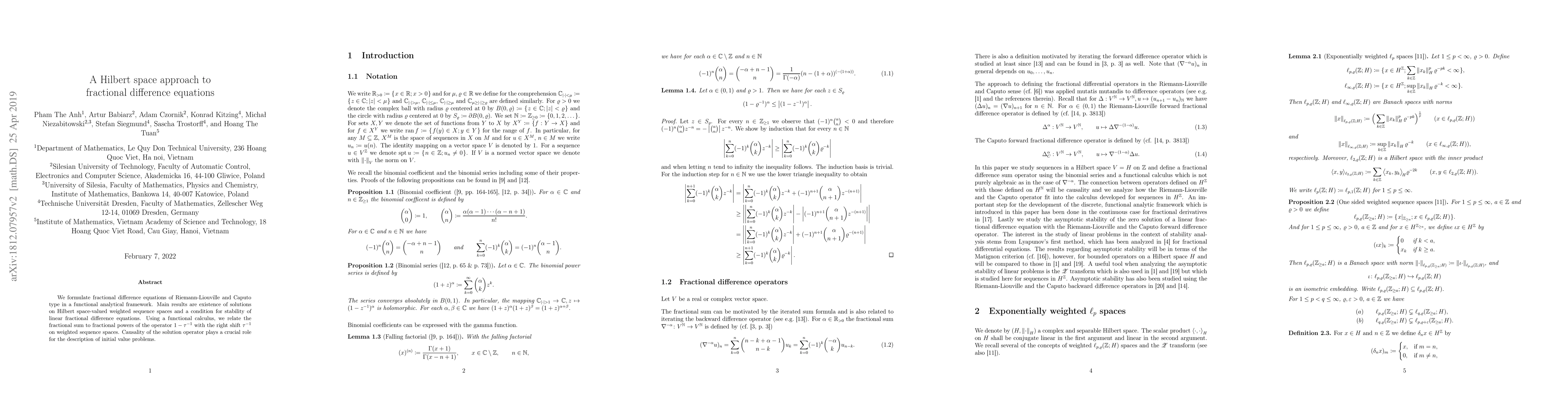 This paper formulates fractional difference equations using a Hilbert space approach, proving existence and stability conditions for solutions in weighted sequence spaces. It employs functional calculus to relate fractional sums to operator powers, emphasizing the role of causality in solving initial value problems.