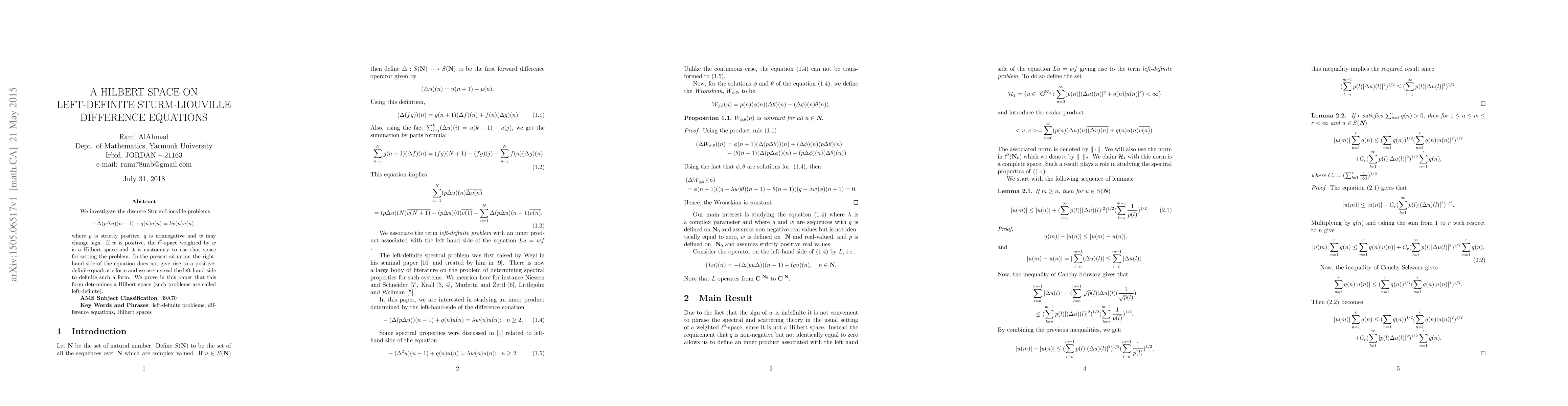 The research investigates discrete Sturm-Liouville equations, focusing on the left-hand side of the equation to define a positive definite quadratic form, which determines a Hilbert space (left-definite problem).