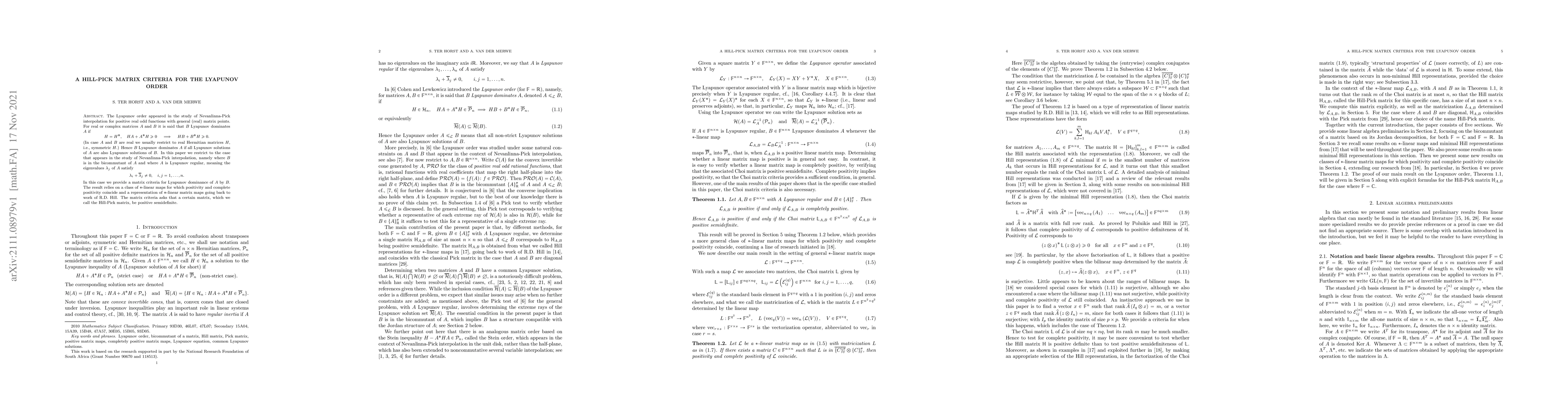 The Lyapunov order appeared in the study of Nevanlinna-Pick interpolation for positive real odd functions with general (real) matrix points. For real or complex matrices $A$ and $B$ it is said that $B$ Lyapunov dominates $A$ if \begin{equation*} H=H^*,\quad HA+A^*H \geq 0 \quad \implies \quad HB+B^*H \geq 0. \end{equation*} (In case $A$ and $B$ are real we usually restrict to real Hermitian matrices $H$, i.e., symmetric $H$.) Hence $B$ Lyapunov dominates $A$ if all Lyapunov solutions of $A$ are also Lyapunov solutions of $B$. In this chapter we restrict to the case that appears in the study of Nevanlinna-Pick interpolation, namely where $B$ is in the bicommutant of $A$ and where $A$ is Lyapunov regular, meaning the eigenvalues $\lambda_j$ of $A$ satisfy \[ \lambda_i + \overline{\lambda}_j \ne 0, \quad i,j=1,\ldots,n. \] In this case we provide a matrix criteria for Lyapunov dominance of $A$ by $B$. The result relies on a class of $*$-linear maps for which positivity and complete positivity coincide and a representation of $*$-linear matrix maps going back to work of R.D. Hill. The matrix criteria asks that a certain matrix, which we call the Hill-Pick matrix, be positive semidefinite.