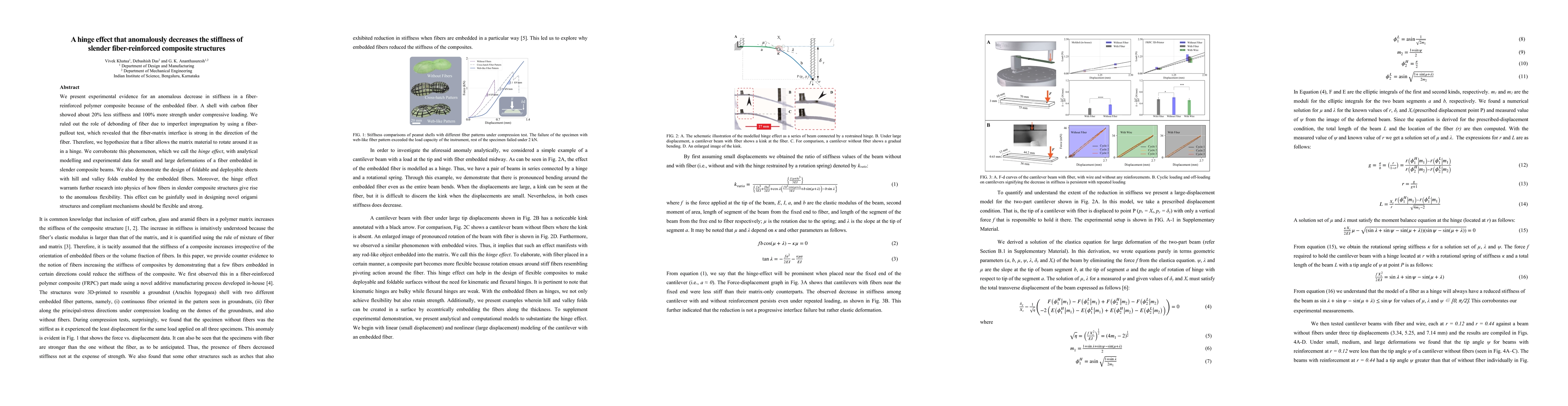 We present experimental evidence for an anomalous decrease in stiffness in a fiber-reinforced polymer composite because of the embedded fiber. A shell with carbon fiber showed about 20% less stiffness and 100% more strength under compressive loading. We ruled out the role of debonding of fiber due to imperfect impregnation by using a fiber-pullout test, which revealed that the fiber-matrix interface is strong in the direction of the fiber. Therefore, we hypothesize that a fiber allows the matrix material to rotate around it as in a hinge. We corroborate this phenomenon, which we call the hinge effect, with analytical modelling and experimental data for small and large deformations of a fiber embedded in slender composite beams. We also demonstrate the design of foldable and deployable sheets with hill and valley folds enabled by the embedded fibers. Moreover, the hinge effect warrants further research into physics of how fibers in slender composite structures give rise to the anomalous flexibility. This effect can be gainfully used in designing novel origami structures and compliant mechanisms should be flexible and strong.