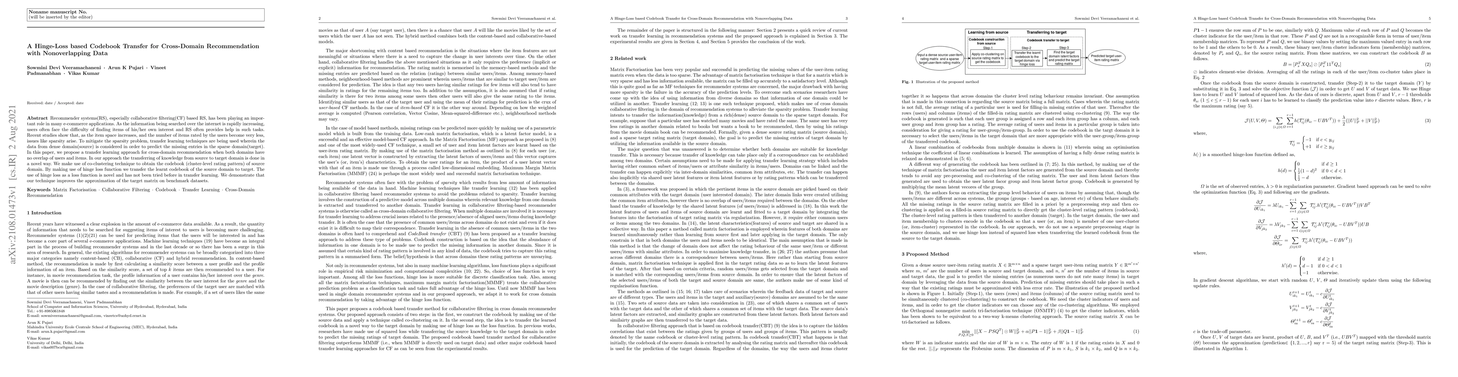 Recommender systems(RS), especially collaborative filtering(CF) based RS, has been playing an important role in many e-commerce applications. As the information being searched over the internet is rapidly increasing, users often face the difficulty of finding items of his/her own interest and RS often provides help in such tasks. Recent studies show that, as the item space increases, and the number of items rated by the users become very less, issues like sparsity arise. To mitigate the sparsity problem, transfer learning techniques are being used wherein the data from dense domain(source) is considered in order to predict the missing entries in the sparse domain(target). In this paper, we propose a transfer learning approach for cross-domain recommendation when both domains have no overlap of users and items. In our approach the transferring of knowledge from source to target domain is done in a novel way. We make use of co-clustering technique to obtain the codebook (cluster-level rating pattern) of source domain. By making use of hinge loss function we transfer the learnt codebook of the source domain to target. The use of hinge loss as a loss function is novel and has not been tried before in transfer learning. We demonstrate that our technique improves the approximation of the target matrix on benchmark datasets.