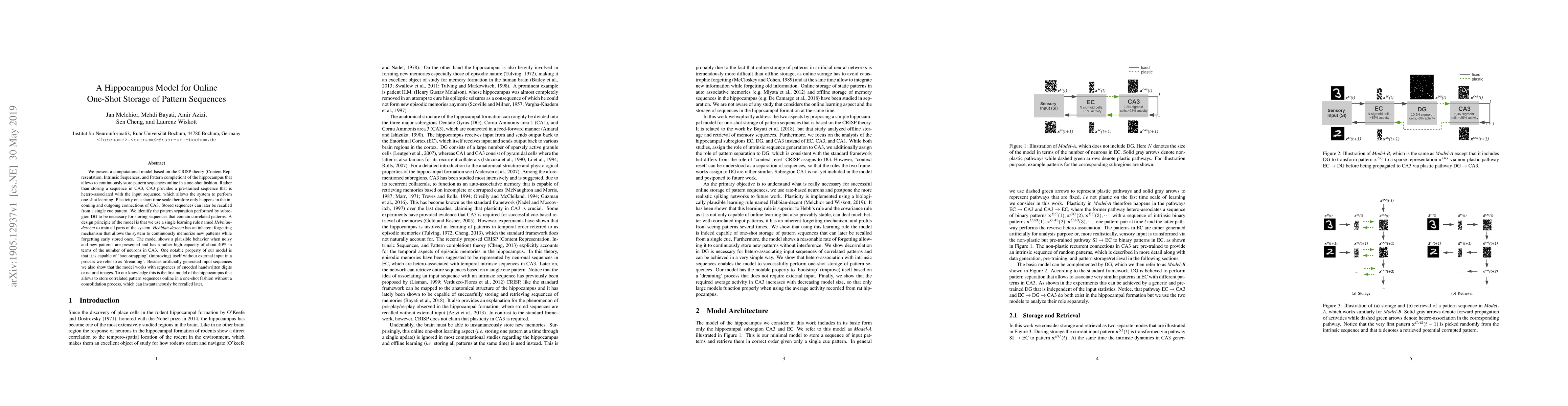 This paper introduces a computational model of the hippocampus based on the CRISP theory, enabling online one-shot storage of pattern sequences via hetero-association in CA3. The model uses a single learning rule, Hebbian-descent, for plasticity and demonstrates high capacity and self-improvement through "dreaming" without external input.