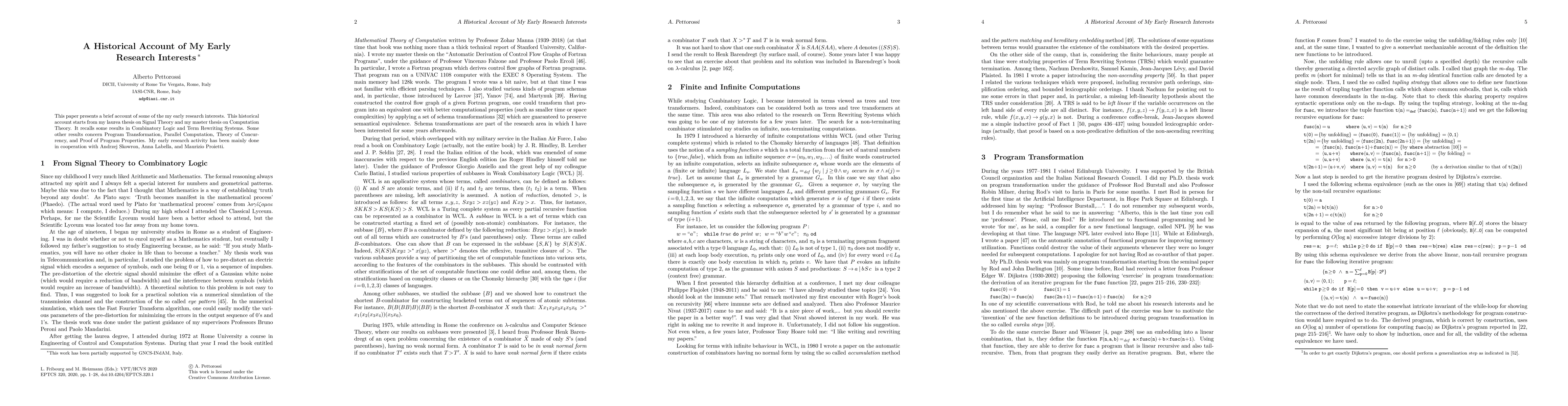 This paper presents a brief account of some of the my early research interests. This historical account starts from my laurea thesis on Signal Theory and my master thesis on Computation Theory. It recalls some results in Combinatory Logic and Term Rewriting Systems. Some other results concern Program Transformation, Parallel Computation, Theory of Concurrency, and Proof of Program Properties. My early research activity has been mainly done in cooperation with Andrzej Skowron, Anna Labella, and Maurizio Proietti.