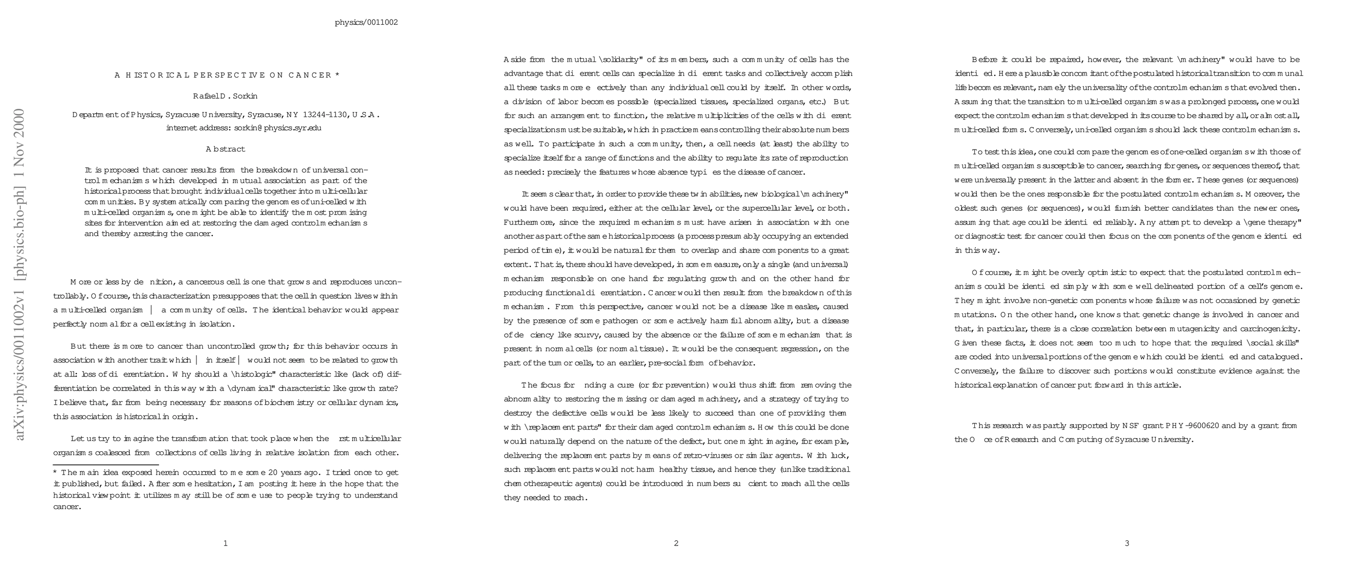 It is proposed that cancer results from the breakdown of universal control mechanisms which developed in mutual association as part of the historical process that brought individual cells together into multi-cellular communities. By systematically comparing the genomes of uni-celled with multi-celled organisms, one might be able to identify the most promising sites for intervention aimed at restoring the damaged control mechanisms and thereby arresting the cancer.