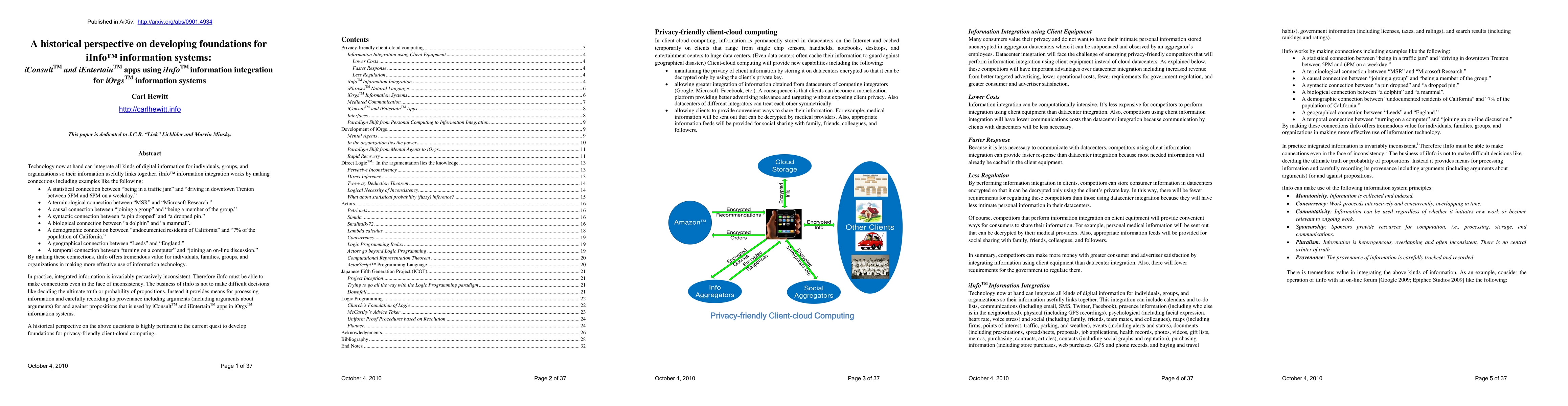 Technology now at hand can integrate all kinds of digital information for individuals, groups, and organizations so their information usefully links together. iInfo(TM) information integration works by making connections including examples like the following: - A statistical connection between "being in a traffic jam" and "driving in downtown Trenton between 5PM and 6PM on a weekday." - A terminological connection between "MSR" and "Microsoft Research." - A causal connection between "joining a group" and "being a member of the group." - A syntactic connection between "a pin dropped" and "a dropped pin." - A biological connection between "a dolphin" and "a mammal". - A demographic connection between "undocumented residents of California" and "7% of the population of California." - A geographical connection between "Leeds" and "England." - A temporal connection between "turning on a computer" and "joining an on-line discussion." By making these connections, iInfo offers tremendous value for individuals, families, groups, and organizations in making more effective use of information technology. In practice, integrated information is invariably pervasively inconsistent. Therefore iInfo must be able to make connections even in the face of inconsistency. The business of iInfo is not to make difficult decisions like deciding the ultimate truth or probability of propositions. Instead it provides means for processing information and carefully recording its provenance including arguments (including arguments about arguments) for and against propositions that is used by iConsult(TM) and iEntertain(TM) apps in iOrgs(TM) Information Systems. A historical perspective on the above questions is highly pertinent to the current quest to develop foundations for privacy-friendly client-cloud computing.
