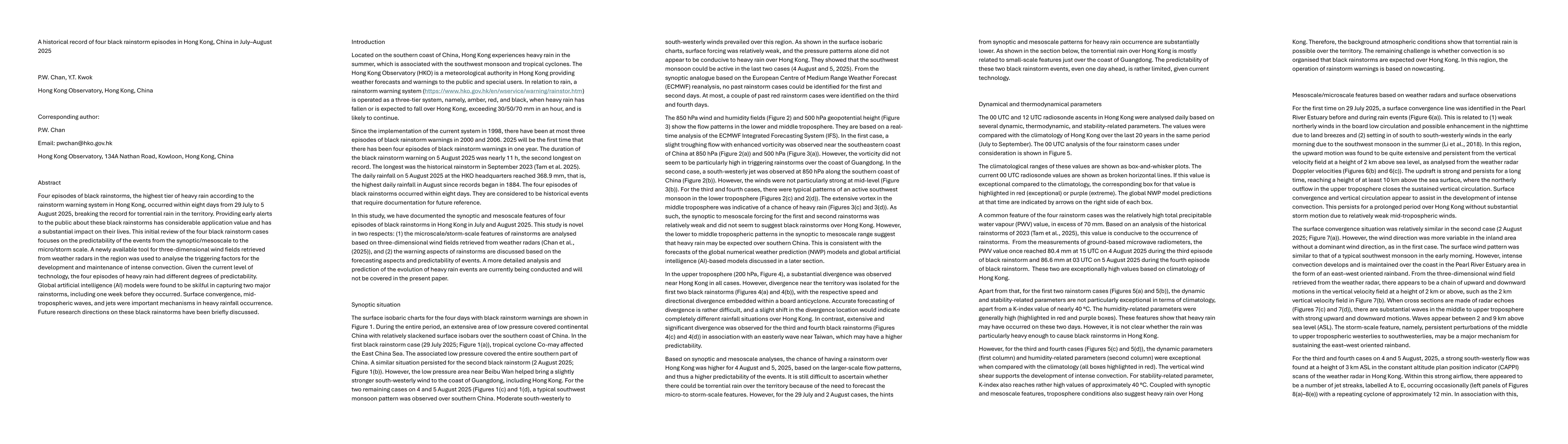 Four episodes of black rainstorms, the highest tier of heavy rain according to the rainstorm warning system in Hong Kong, occurred within eight days from 29 July to 5 August 2025, breaking the record for torrential rain in the territory. Providing early alerts to the public about these black rainstorms has considerable application value and has a substantial impact on their lives. This initial review of the four black rainstorm cases focuses on the predictability of the events from the synoptic/mesoscale to the micro/storm scale. A newly available tool for three-dimensional wind fields retrieved from weather radars in the region was used to analyse the triggering factors for the development and maintenance of intense convection. Given the current level of technology, the four episodes of heavy rain had different degrees of predictability. Global artificial intelligence (AI) models were found to be skilful in capturing two major rainstorms, including one week before they occurred. Surface convergence, mid-tropospheric waves, and jets were important mechanisms in heavy rainfall occurrence. Future research directions on these black rainstorms have been briefly discussed.