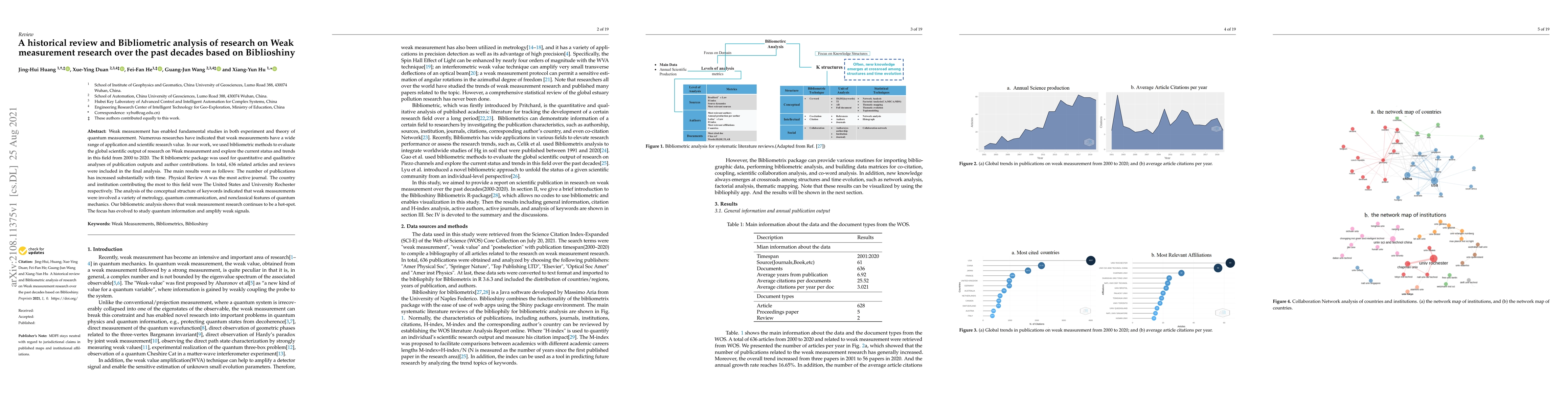 This paper conducts a bibliometric analysis of weak measurement research from 2000 to 2020, revealing a substantial increase in publications and highlighting the United States and University Rochester as leading contributors. The study identifies evolving research trends towards quantum information and signal amplification.