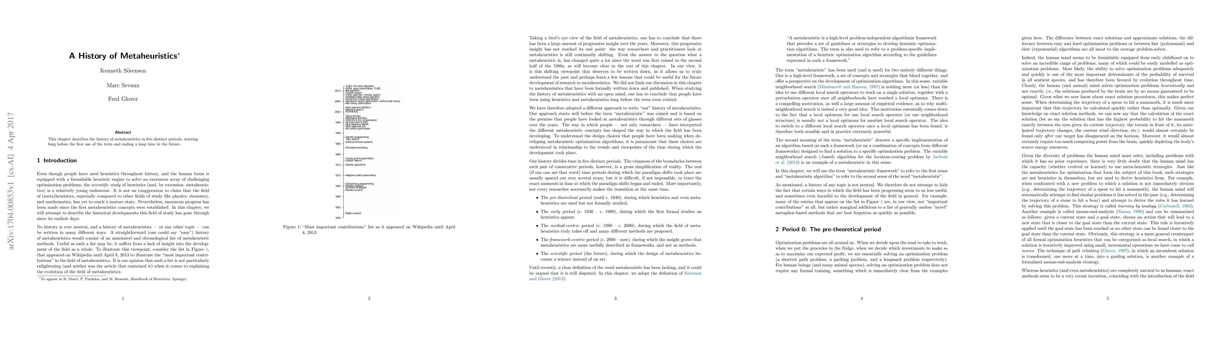 This chapter describes the history of metaheuristics in five distinct periods, starting long before the first use of the term and ending a long time in the future.