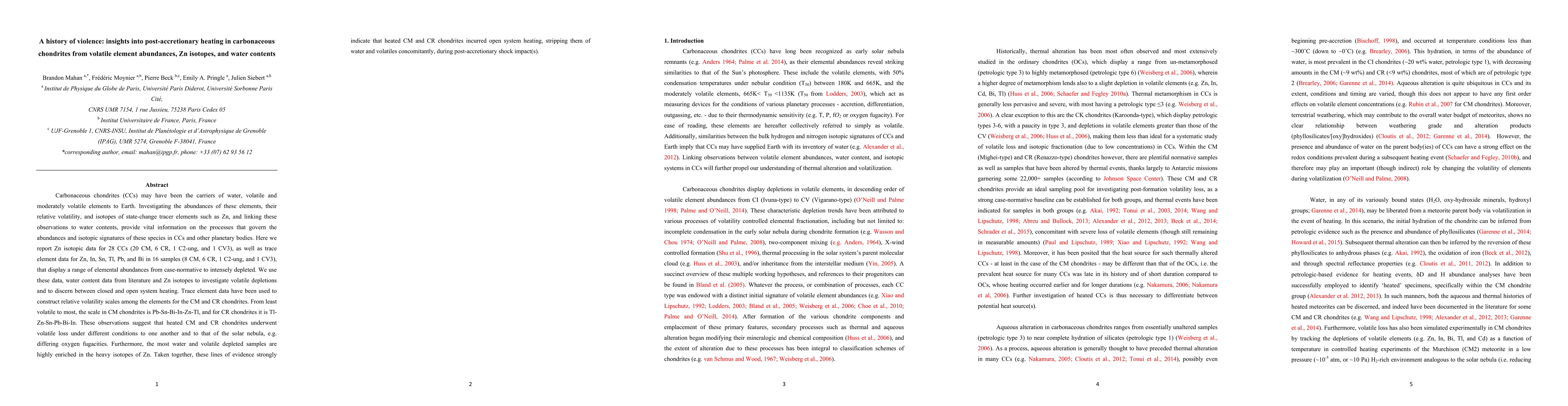 Research on carbonaceous chondrites reveals that heated samples lost water and volatiles under open system conditions due to varying oxygen fugacities, while closed system heating resulted in depleted volatile content with heavier Zn isotopes.