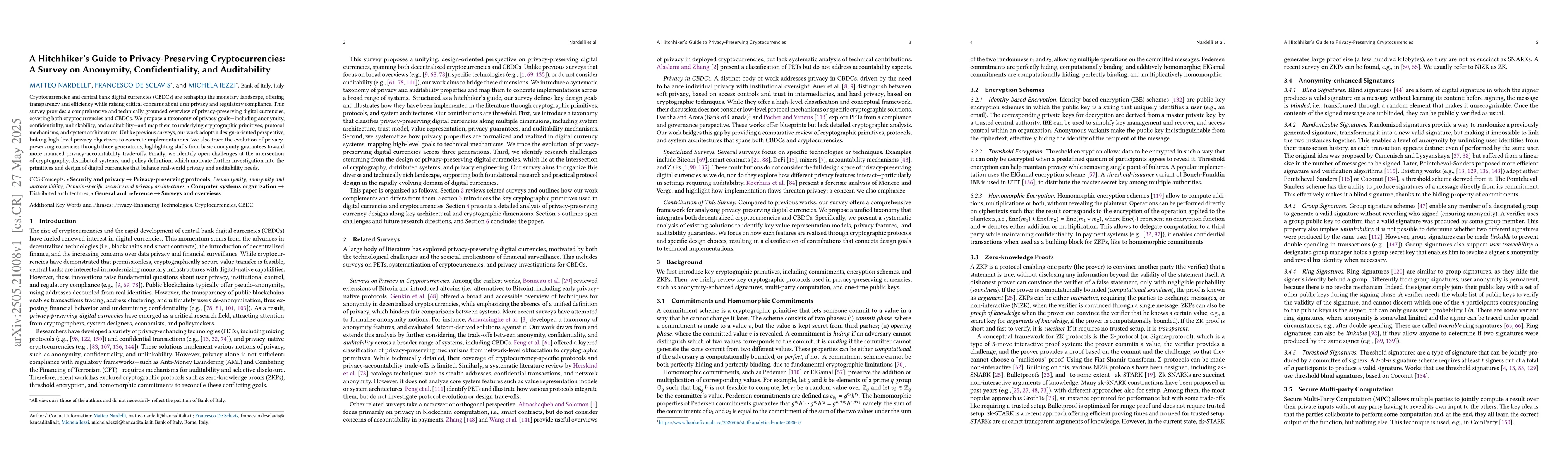 A survey on privacy-preserving cryptocurrencies explores how to balance user anonymity with regulatory compliance, identifying key challenges in cryptography and system design. It proposes a framework for categorizing privacy goals and tracing the evolution of digital currencies.
