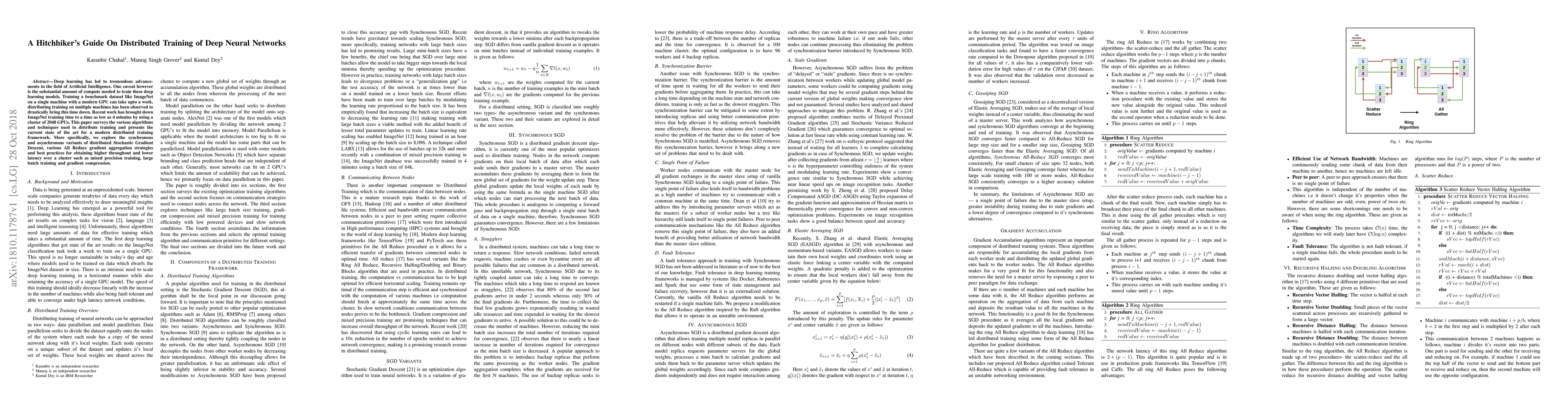 Deep learning has led to tremendous advancements in the field of Artificial Intelligence. One caveat however is the substantial amount of compute needed to train these deep learning models. Training a benchmark dataset like ImageNet on a single machine with a modern GPU can take upto a week, distributing training on multiple machines has been observed to drastically bring this time down. Recent work has brought down ImageNet training time to a time as low as 4 minutes by using a cluster of 2048 GPUs. This paper surveys the various algorithms and techniques used to distribute training and presents the current state of the art for a modern distributed training framework. More specifically, we explore the synchronous and asynchronous variants of distributed Stochastic Gradient Descent, various All Reduce gradient aggregation strategies and best practices for obtaining higher throughout and lower latency over a cluster such as mixed precision training, large batch training and gradient compression.